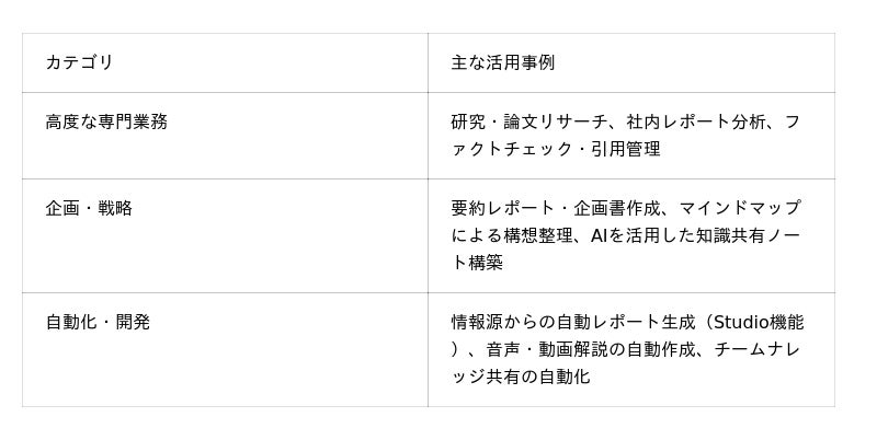 NotebookLMの自動要約・分析・共有機能を活かし、ビジネスや教育の現場で活用できる実践例を紹介します。