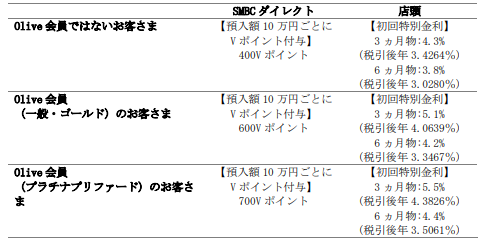 また、為替手数料の一部無料化にあわせて、Vポイントまたは初回特別金利を特典とする「米ドル定期預金キャンペーン」を開始いたします。本キャンペーンでは、Oliveアカウントの方にはより多くの特典をご用意しています。