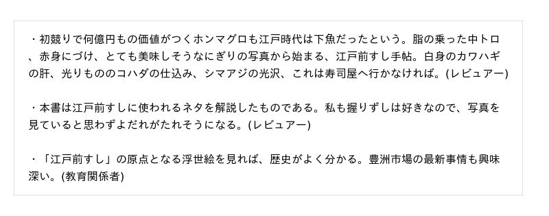 江戸時代の握りずし誕生前夜から現代までを通観する、巻末の「江戸前すしアーカイブス」は、本書のもうひとつの読みどころ。豊富な浮世絵や歴史資料を眺めながら、1貫の背景にある文化と、時代の味覚を感じ取れます。