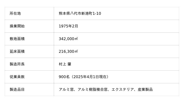 九州製造所は、1975年2月に当社の国内4番目にアルミ建材の素材から加工までを担う一貫生産工場として操業を開始しました。その後、2016年の熊本地震による建屋や生産設備への被害などを乗り越え、生産性の向上などにも挑み続けてきました。現在は住宅やビル用のアルミ窓・アルミ樹脂複合窓、門扉やフェンスなどのエクステリア商品や産業用形材などを生産し、九州エリアおよび全国各地へ高品質な商品をお届けしています。また、主にプロユーザーを対象とした提案施設として、ガーデンエクステリアの世界を分かりやすく提案する「エクステリアパーク」や窓の断熱性能を比較体感できる「P-STAGE八代」を併設し、コミュニケーション基地としての役割も担うほか、エクステリア施工技能者育成のための研修施設「DO SPACE 九州」も開設し、技能伝承にも取り組んでいます。さらに、敷地内には大きな円形の池が配置されており、アルミの表面処理を行った水などの工場排水を溜めて海に流す前の水質の監視を行うなど排水の環境負荷低減に取り組んでいます。また、この池を活用し、2010年からは、絶滅危惧種であるニホンメダカの飼育・寄贈を通じて、地域社会との“つながり”を推進する環境教育支援活動を継続して行っています。