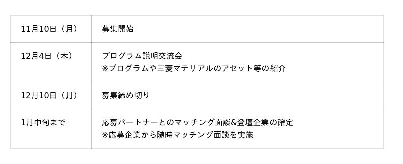 本プログラムは三菱マテリアルが新規事業創出において、三菱マテリアルにはないアセットを有するスタートアップ企業などとの事業協創を加速させることを目的としています。また昨年度からは三菱マテリアルが保有するアセットを活用する形での協業事業案も同時に募っております。
