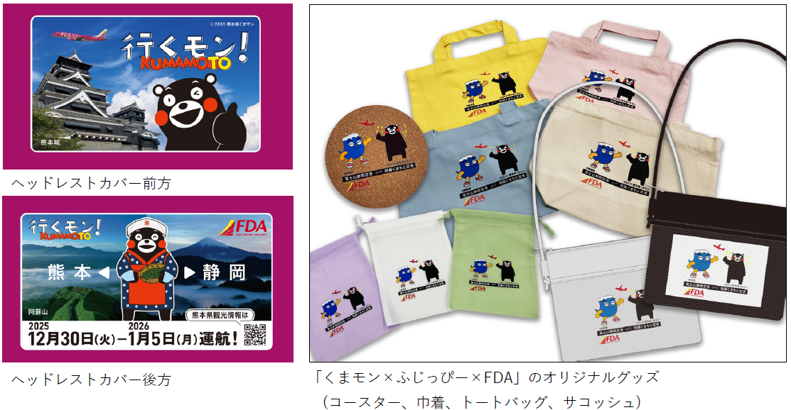 また、「熊本=静岡」線にご搭乗のお客さまを対象に「くまモン×ふじっぴー×FDA」のオリジナルグッズをプレゼントいたします。