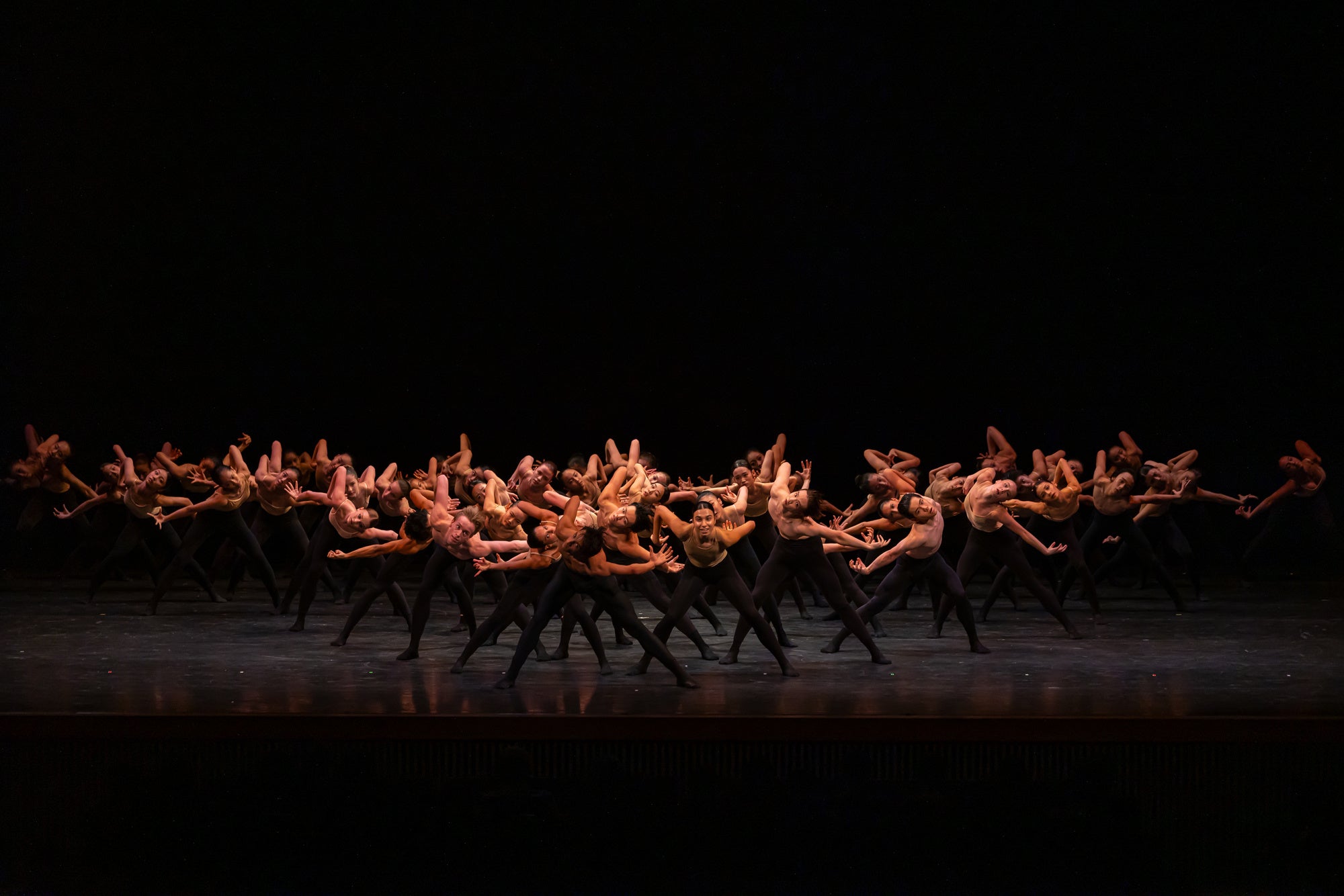 公演の最後を飾ったのは、気鋭の振付家シャハール・ビンヤミニによる『ボレロ X』。各バレエ学校の生徒や、世界各国から選抜されたメンバーで構成されるICE(インターナショナル・コンテンポラリー・アンサンブル)の約60名が、ラヴェル作曲「ボレロ」の音楽に呼応し、やがて舞台全体に生命のうねりを広げ、最後には観客を包み込み、圧倒的なエネルギーの解放と余韻を残して全プログラムが終了しました。