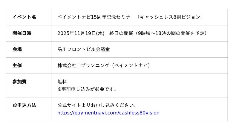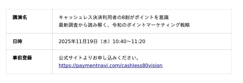 この度、ジー・プラン株式会社(本社:東京都品川区、代表取締役執行役員社長:竹内 庸真/以下、ジー・プラン)は、2025年11月19日(水)にペイメントナビが主催する「ペイメントナビ15周年記念セミナー・キャッシュレス8割ビジョン」(東京・品川)に登壇いたします。本講演では、ジー・プランの最新の独自調査データに基づき、キャッシュレス決済利用者の約8割がポイントを意識しているという実態を明らかにします。ポイントが顧客のロイヤルティ向上や行動変容を促す重要なツールであることを解説し、企業のマーケティング課題解決に貢献する情報を提供します。