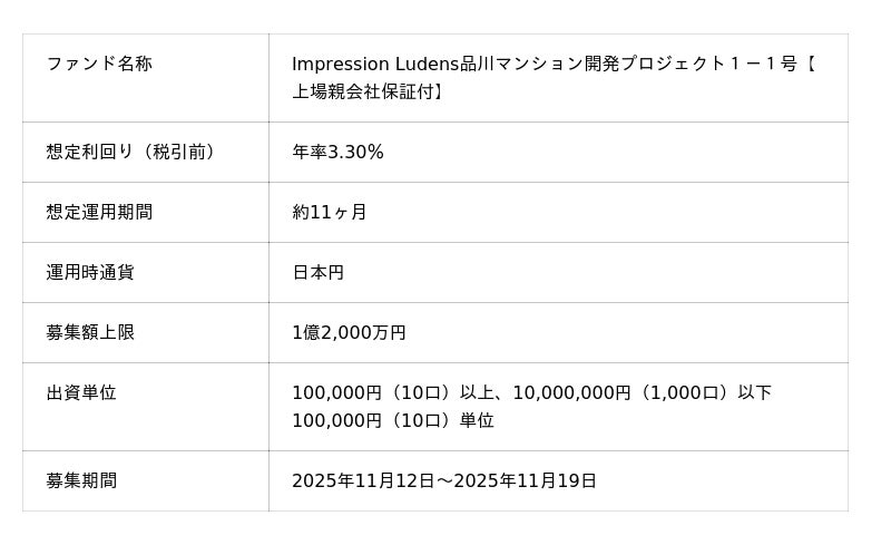 貸付型クラウドファンディング「Funvest」11/12より新ファンド「Impression Ludens品川マンション開発プロジェクト1-1号【上場親会社保証付】」の募集開始