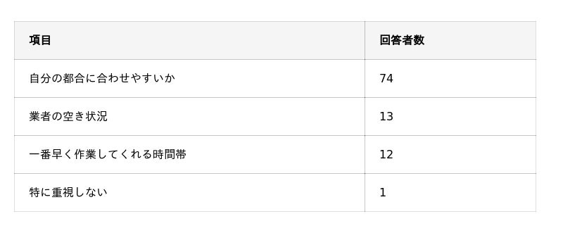エアコンクリーニングの作業時間帯を選ぶ際に最も重視するポイントは何ですか?