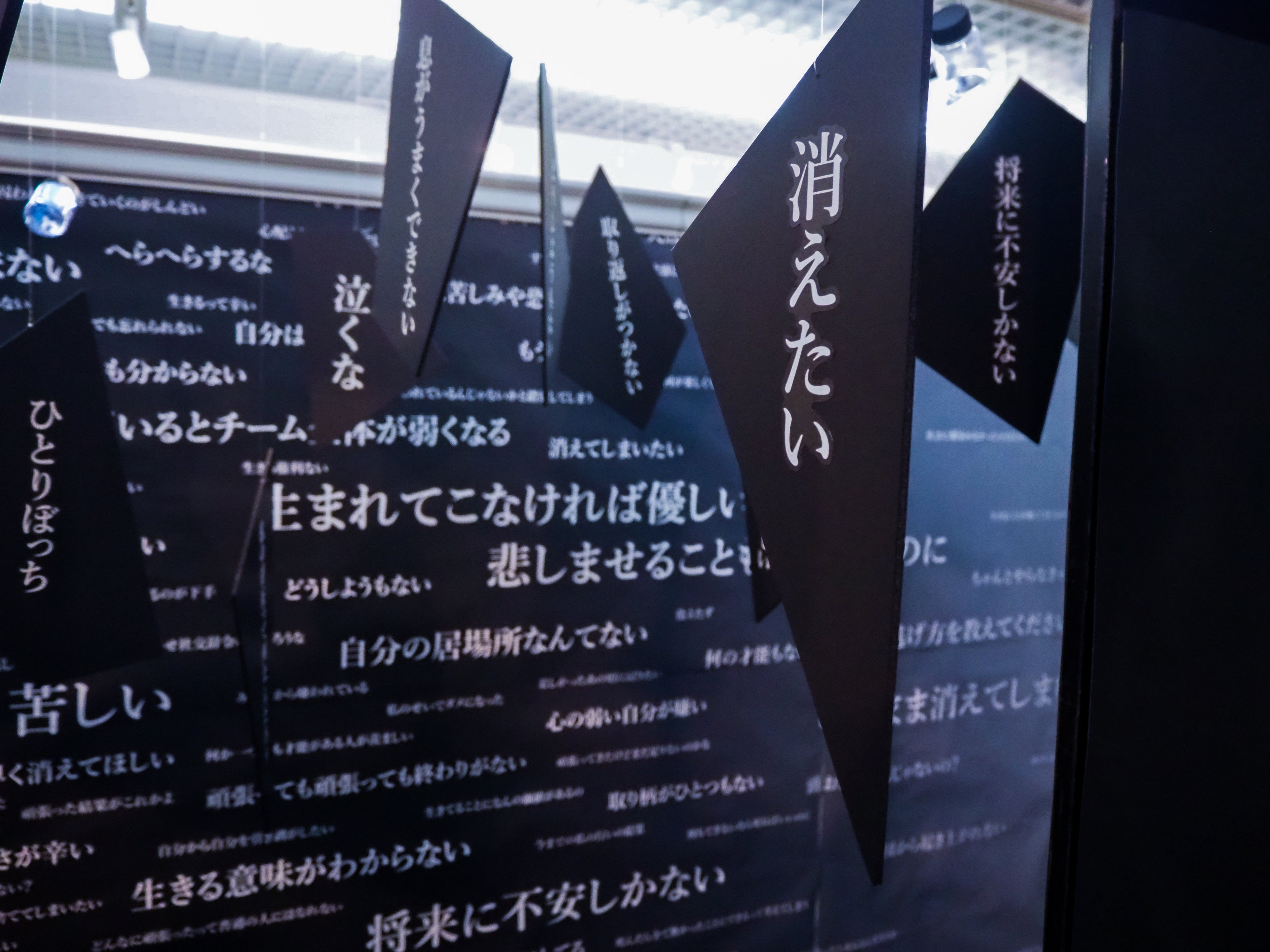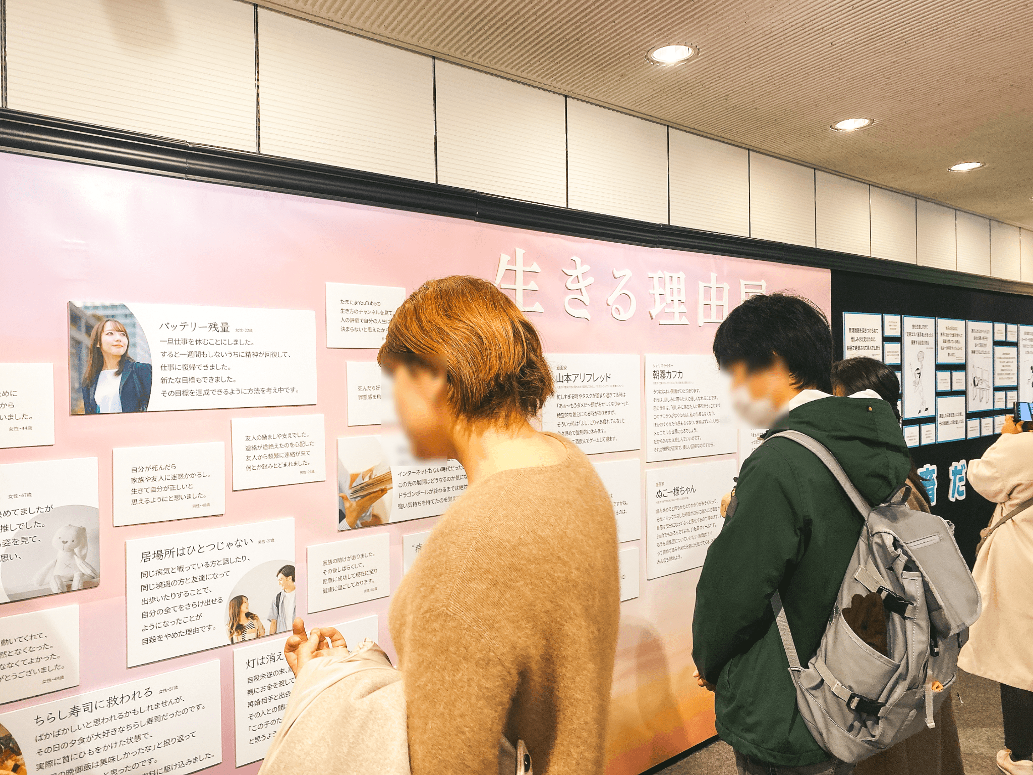 生きる理由展「自殺をやめて生きようと思った理由」を展示しています。悩みを抱えた多くの方が、ギリギリのラインで揺れ動きながら、生きています。