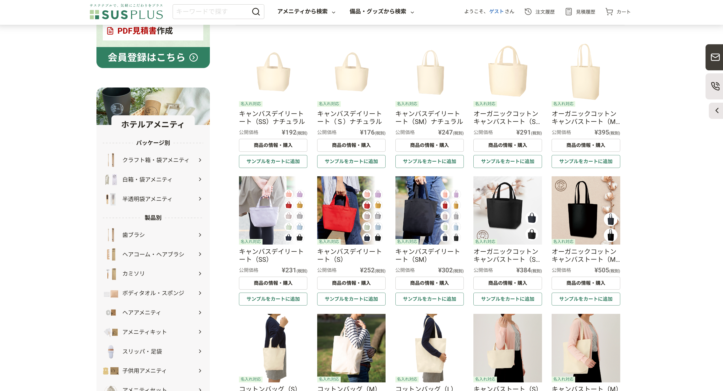 中でも注目は、バッグの掲載数の豊富さです。開業記念や周年記念のノベルティとしてはもちろん、近年宿泊時に館内で使用できる客室備品として需要が高まる中、「SUSPLUSを見ればほしいバッグが見つかる」状態を目指すべく、約400種の製品をラインアップ。コットン・リネン・キャンバスなど多彩さに加え、巾着・肩掛け・マルシェなど、形状の豊富さも見所です。