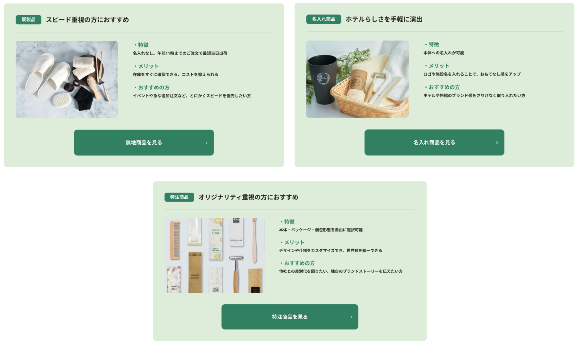 ホテル・旅館の現場で必要とされるスピード感・ブランドらしさ・独自性に応えるため、サイト内では「既製品」「名入れ」「オリジナル制作」の3タイプをご用意しました。用途や目的に合わせて、最適な商品をお選びいただけます。