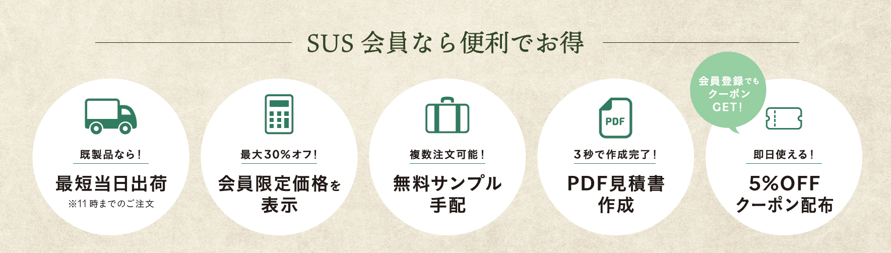 SUSPLUSでご注文いただく際は、会員登録が必要です。登録すると、最大30%OFFの会員限定価格を表示・無料サンプルを複数ご手配可能など、全部で5つの特典を受けられます。今ならその場で使用可能な5%OFFクーポンももらえるため、この機会に、ぜひ一度ご利用ください。