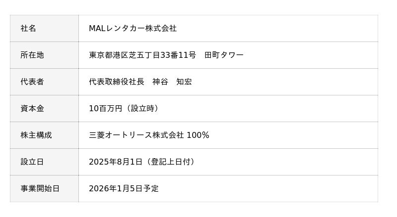 三菱オートリース株式会社(本社:東京都港区、代表取締役社長:高井直哉)は、この度、レンタカー事業の運営を担う100%出資子会社「MALレンタカー株式会社」を設立いたしました。