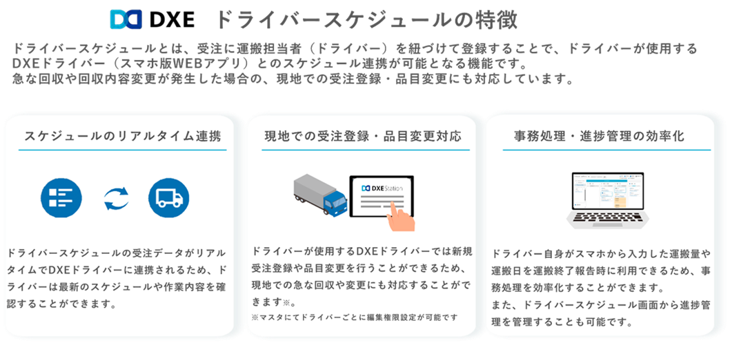新機能「ドライバースケジュール」は、WEB管理画面とドライバー向けスマートフォンWEBアプリ「DXE Driver」をリアルタイムで連携させ、現場と事務所の情報格差を解消します。