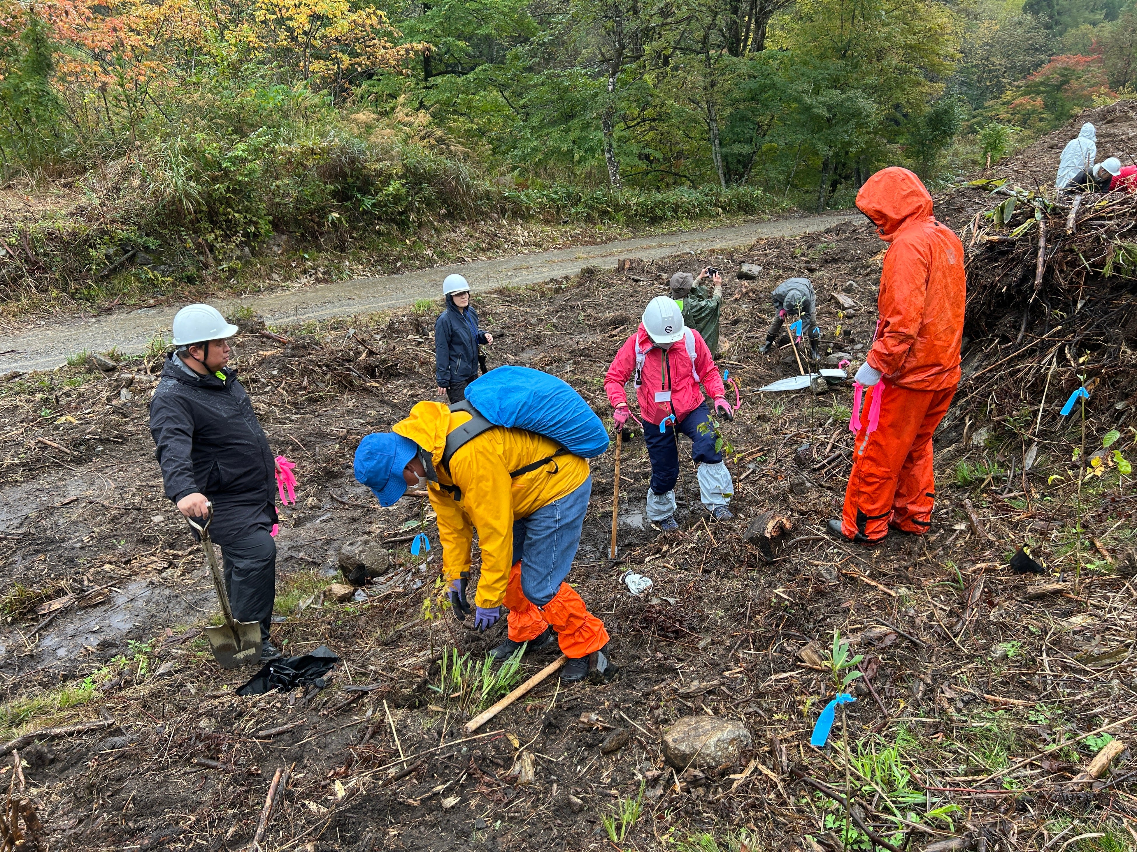 植樹祭では、地元植生の広葉樹であるイタヤカエデとヤマザクラを合計100本植樹。生憎の雨模様となりましたが、参加者からは「しっかりクワを使って植えることができて楽しかった」「飛騨高山の森に愛着が沸きました」といったポジティブな声が多く寄せられました。