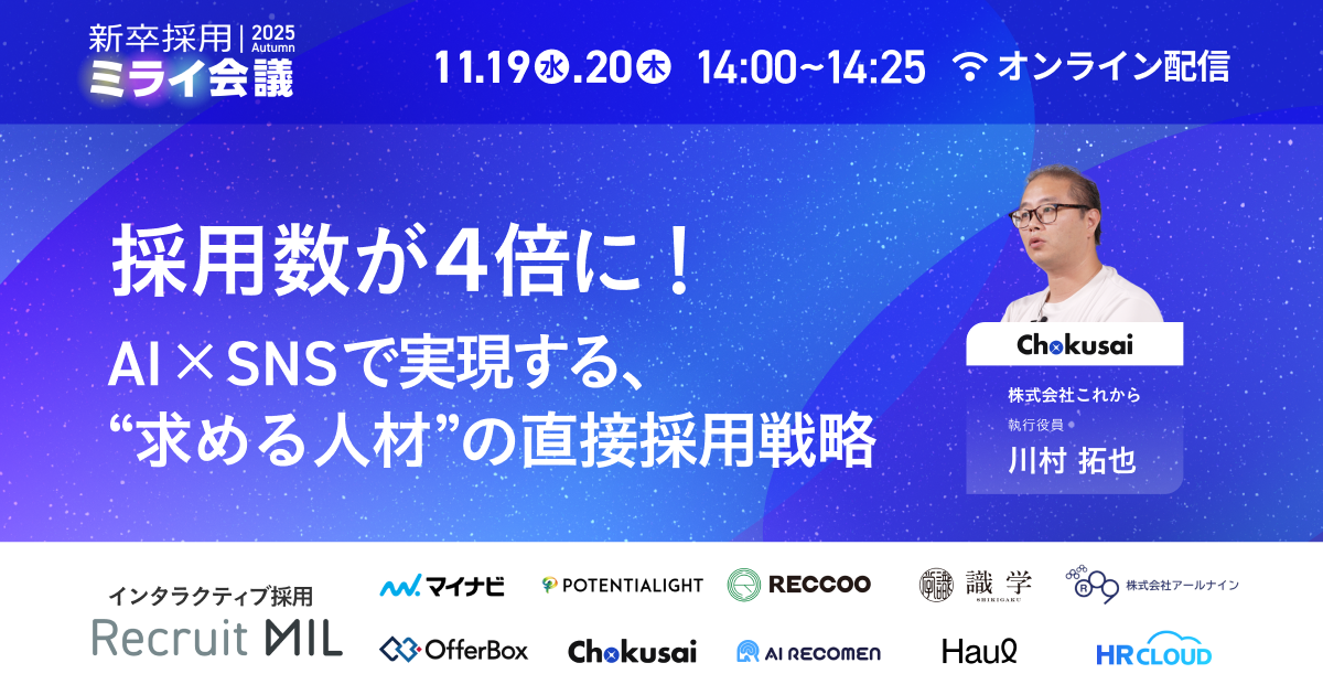 SNSを活用した直接採用ツール「Chokusai(チョクサイ)」を提供する株式会社これから(本社:東京都新宿区、代表取締役:今泉 雄介)は、MIL株式会社(本社:東京都新宿区、代表取締役CEO:光岡 敦)主催のオンラインイベント「新卒採用ミライ会議 2025 秋」に登壇することをお知らせいたします。