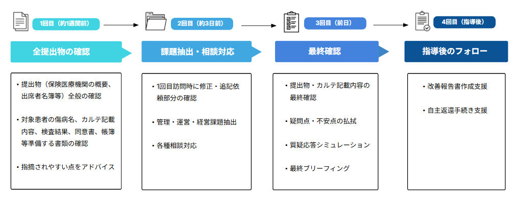 - 約1~3カ月後(指導後のフォロー):必要時、改善報告書の作成支援や自主返還手続き支援を行います。