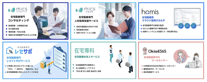 在宅医療専門クリニックのために開発された在宅医監修の電子カルテ「homis」をはじめ、在宅医療クリニックの開業・経営を支援する「micsコンサルティング」、在宅医療専門レセプト代行サービス「レセサポ」、在宅医療の求人サービス「在宅専科」など、在宅医療クリニックの課題に応じ総合的にサービスを提供しています。