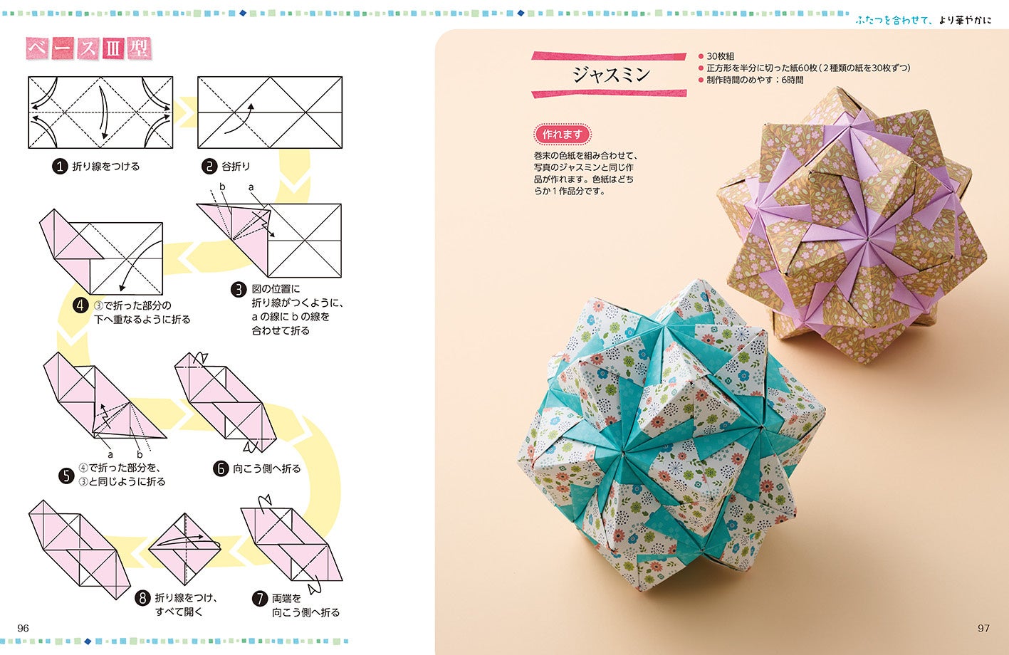 ひとつのユニットで表情豊かに!「ベース」の折り線を変えることで、同じユニットでも違う印象のくす玉を作ることができます。