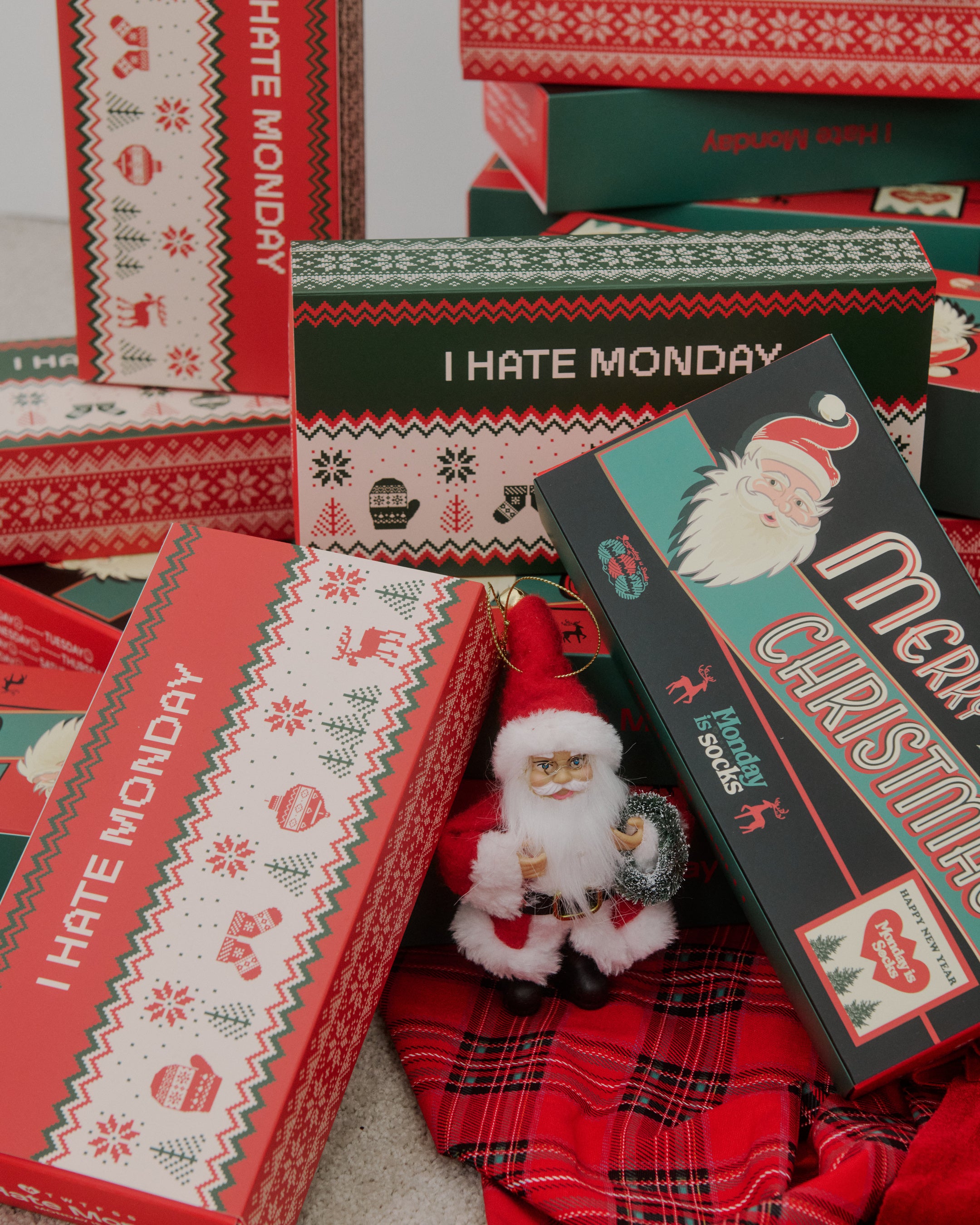 今回のラインナップは、まるで綿あめのようにふわふわの「Candyfloss Socks(キャンディフロスソックス)」や、クリスマスをモチーフに遊び心あふれる「Christmas Socks(クリスマスソックス)」などのユニークなソックスに加え、手袋とアームウォーマーがセットになった「Monday Glove(マンデーグローブ)」、ブランドのアイコニックなパターンを用いた「Monday Foot Mat(マンデーフットマット)」など、冬の暮らしを彩るアイテムが勢ぞろいします。