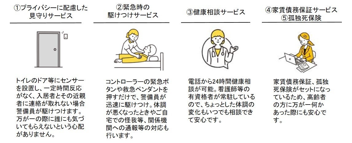 「エイブルシニアパック」では、エイブルの管理物件にてご契約いただいた方(※2)を対象とし、ALSOK株式会社(本社:東京都港区)が提供する安否確認センサーの設置や、いざという時に通報できる緊急ボタンが付いたコントローラー、救急ペンダントのお渡し、看護師資格等を持つスタッフに24時間健康相談ができるサービスを提供。さらに、株式会社エポスカード(本社:東京都中野区)とも連携し、エポスカードが提供する家賃債務保証サービスを使用し、エポスカードをお持ちの方またはカード発行された方は毎月の保証料が無料となるサービスとなります。これら全てのサービスがセットになった高齢者向けの住まい支援サービスは日本でもほとんどなく、また料金についても業界最安水準(※3)を目指しました。
