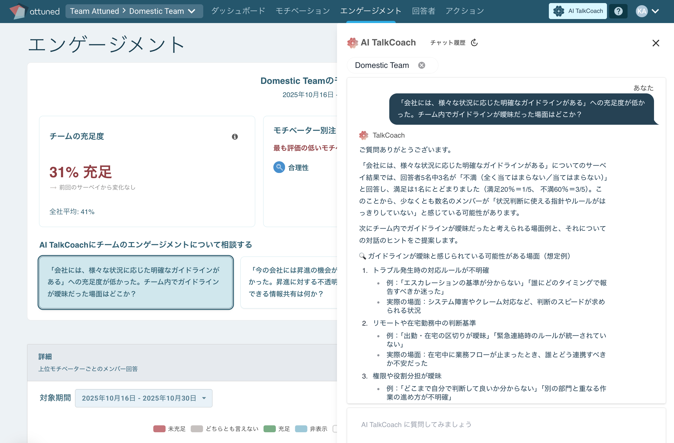 今回のアップデートは、UI/UXを刷新しデータの視認性を高めるとともに、Attunedの核である「AI TalkCoach(AIトークコーチ)」機能をエンゲージメント・ダッシュボード上に統合するものです。これにより、Attunedが収集する「個人に最適化された良質なデータ」に基づき、多忙なマネージャーが「今、具体的に何をすべきか」をピンポイントで理解し、即座に行動に移すことを可能にします。