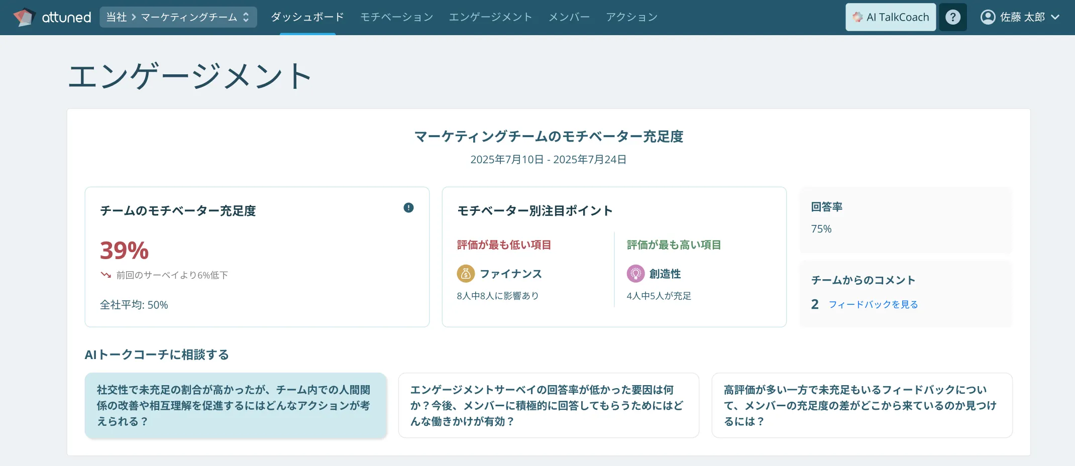 今回のダッシュボードのアップデートは、エンゲージメントデータを、多忙なマネージャーのための「実行可能なアクション」に即座に変換することを目的としているものです。1. 刷新されたUI/UXと「AI TalkCoach」への統合