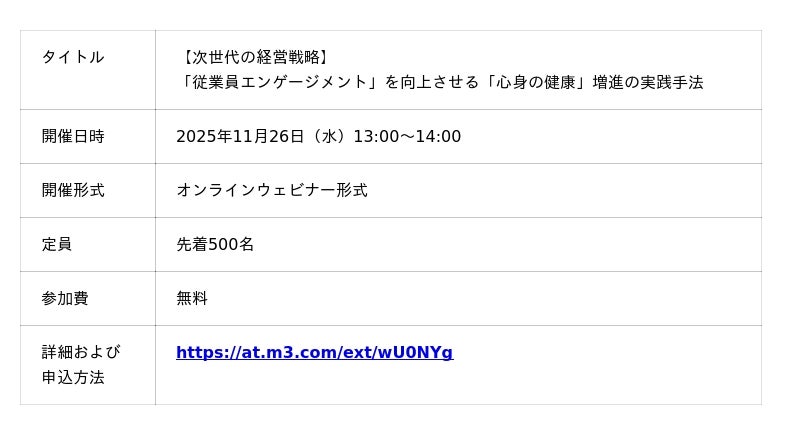 疾病予防を通じて豊かな未来を目指す取り組み「ホワイト・ジャック・プロジェクト」を推進するエムスリー株式会社(本社:東京都港区、代表取締役:谷村 格、以下「エムスリー」)は、企業の健康経営(R)を支援する事業の一環として、2025年11月26日(水)にオンラインセミナー『【次世代の経営戦略】「従業員エンゲージメント」を向上させる「心身の健康」増進の実践手法』を開催いたします。