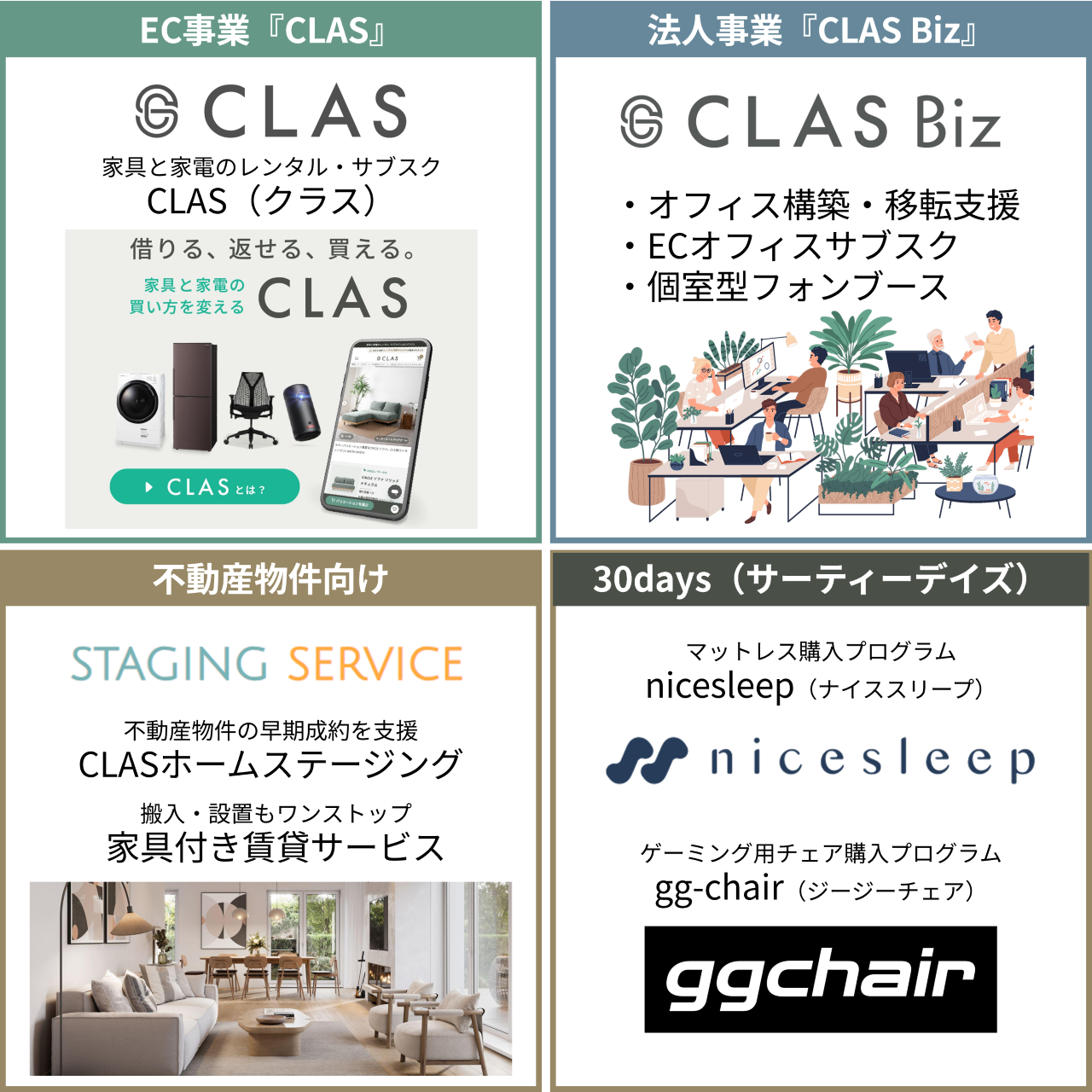 クラスは、「“暮らす”を自由に、軽やかに」をビジョンに、耐久消費財の循環型プラットフォームを運営。個人向け家具と家電のレンタル・サブスク『CLAS』、法人向けオフィス構築・移転『CLAS Biz』、不動産物件の早期成約を支援するインテリアコーディネート『CLASホームステージング』などのサービスを展開しています。