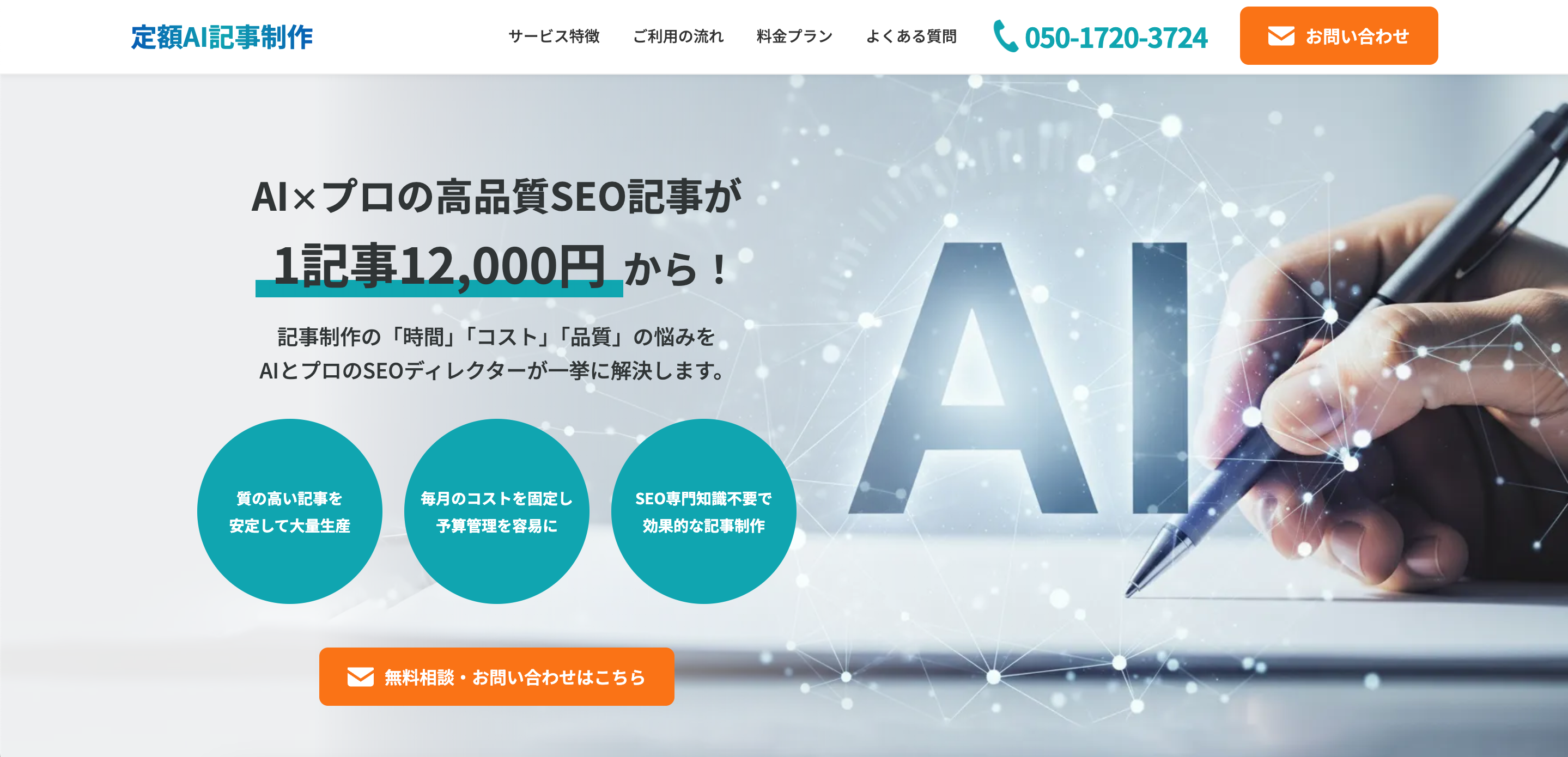 1記事12,000円(5本~/ベーシック月額6万円)から、キーワード受領→AI生成→専門家チェック→納品までを一気通貫で実施。LLMO/AIOに配慮した情報設計で検索流入の最大化を狙います。大量発注・長文にも柔軟対応し、CMS入稿、キーワード調査・クラスタリング、SEOコンサル等の拡張も可能です。