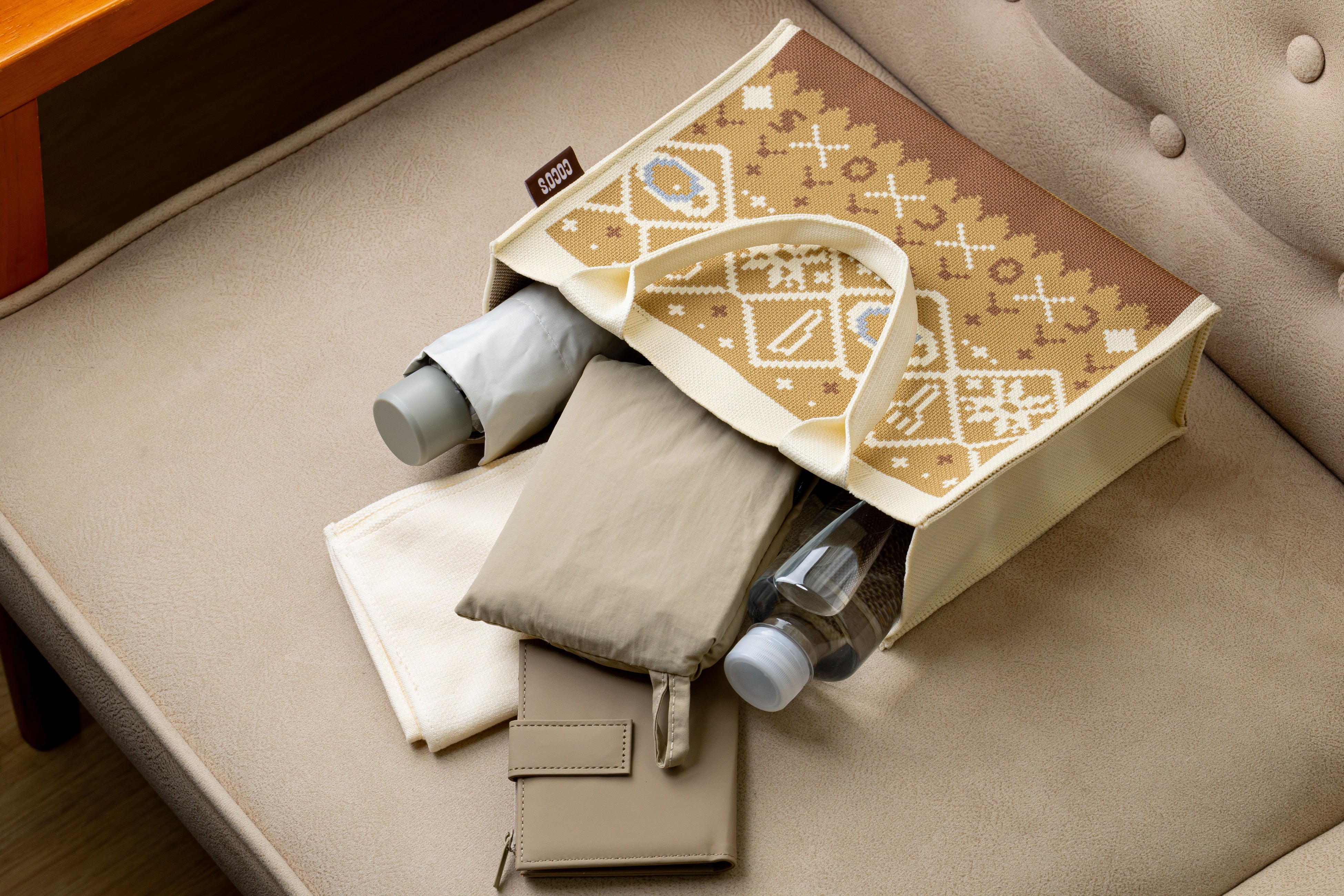 包み焼きハンバーグのビーフシチューソースをイメージしたブラウンを基調に、冬のコーディネートに合わせやすい温かみのある色味に仕上げました。500mlペットボトルや折り畳み傘も入る使いやすいサイズで、生地に厚みがあり、マチがあるため、自立します。お散歩やショッピングなど、冬のお出かけシーンで大活躍すること間違いなしです。