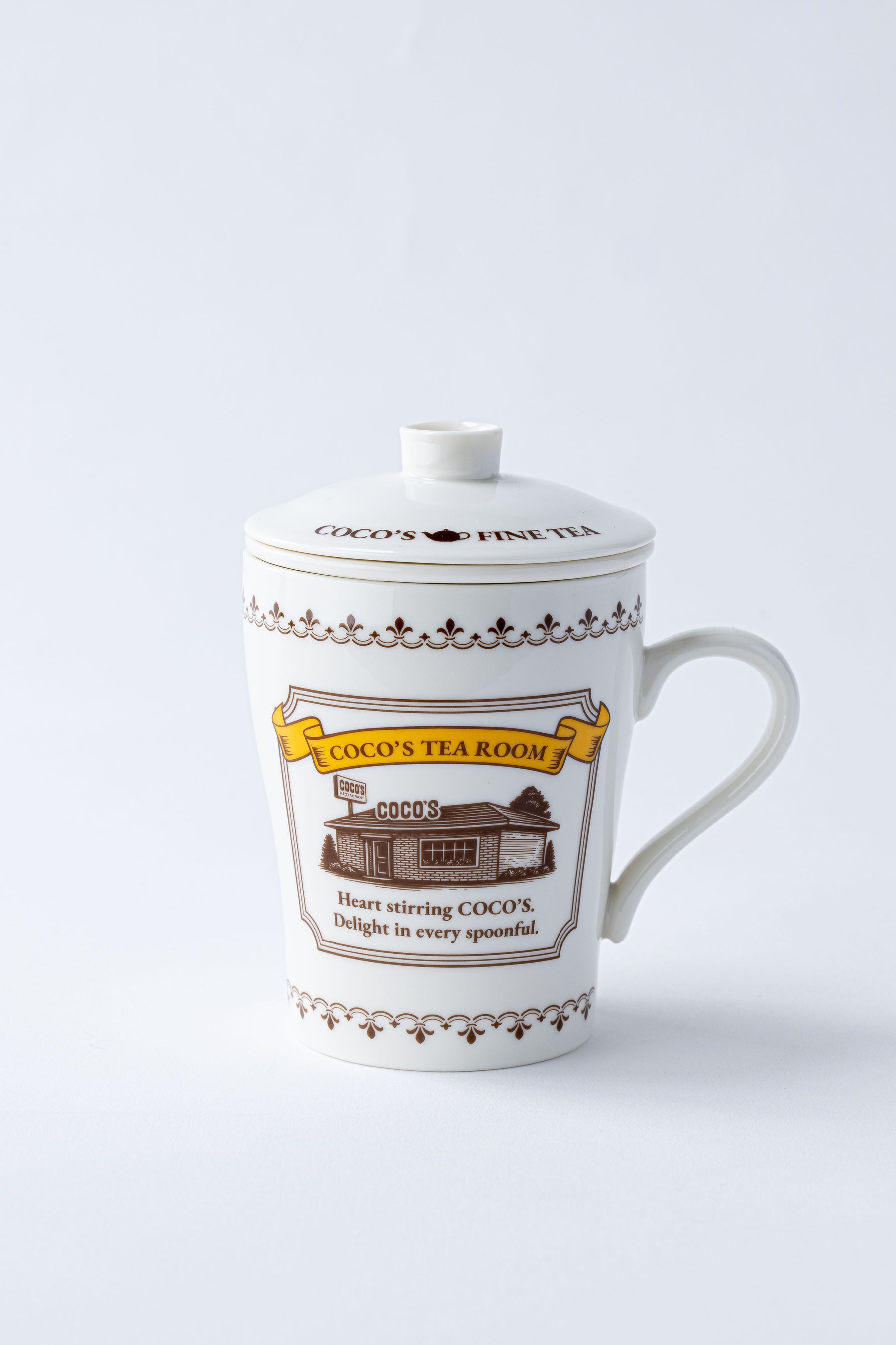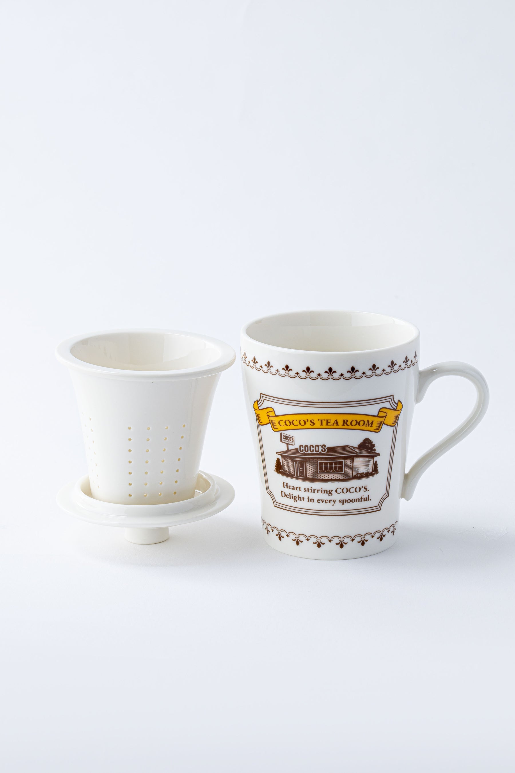 ココスの店舗が英国風のイラストで描かれた、茶こし付きの陶磁器製マグカップです。陶磁器の程よい重みとレトロなデザインが重厚感と高級感を演出します。