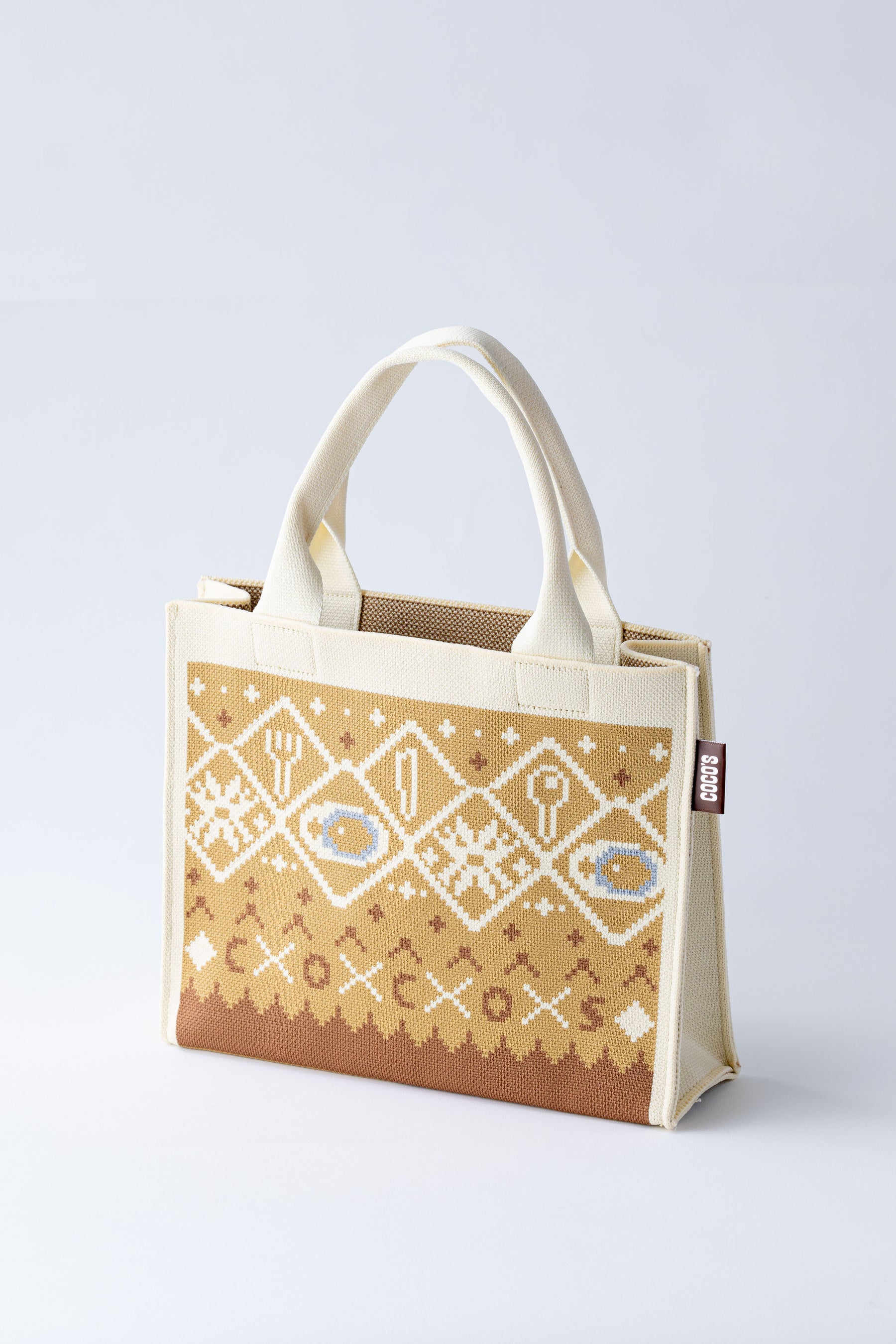 包み焼きハンバーグやナイフ、スプーン、フォークといったココスらしい商品をデザインに取り入れた、冬にぴったりなノルディック柄のニットバッグです。