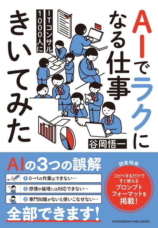 ビジネス書や実用書を中心に出版する株式会社クロスメディア・パブリッシング(本社:東京都渋谷区、代表取締役社長:小早川幸一郎)は、2025年2月21日に書籍『ITコンサル1000人にAIでラクになる仕事きいてみた』を刊行します。著者の谷岡悟一さんは、コンサルティングファーム「ノースサンド」のトップコンサルタント。ITコンサルタントとして20年以上のキャリアを持ち、最新のIT、DX、AI動向を注視しながら、企業の成長戦略を支援してきました。本書は、同社のITコンサルタント1000名に対する調査をもとに、仕事の場面ごとに使えるAI活用法をまとめた一冊です。あまりAIを使ったことがない初心者の方でも簡単に、本書の内容を実践することができます!