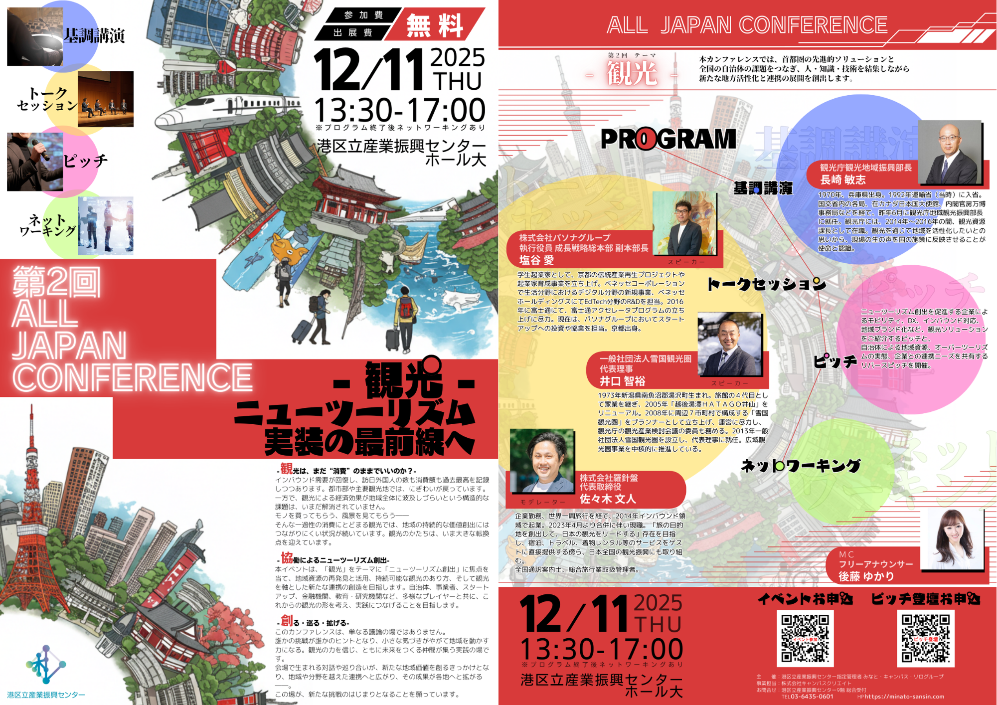 ALL JAPAN CONFERENCE とは・・・港区立産業振興センター(港区芝5-36-4 札の辻スクエア内)が主催する、首都圏のソリューションと全国の自治体の課題をつなぎ、人・知識・技術を集結しながら新たな地方活性化と連携の創出を目指すイベントです。