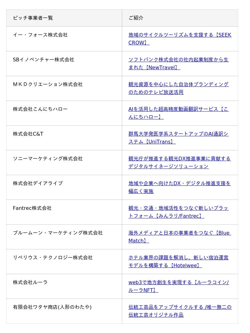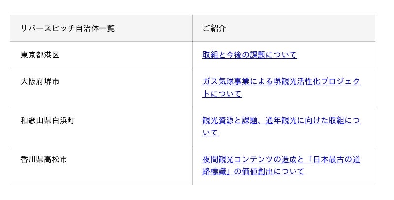 このたび、観光領域で活躍する12事業者のピッチ登壇、4自治体のリバースピッチ登壇が決定しました。次代を切り拓くソリューションと情熱が交差する、見逃せない一日となります。