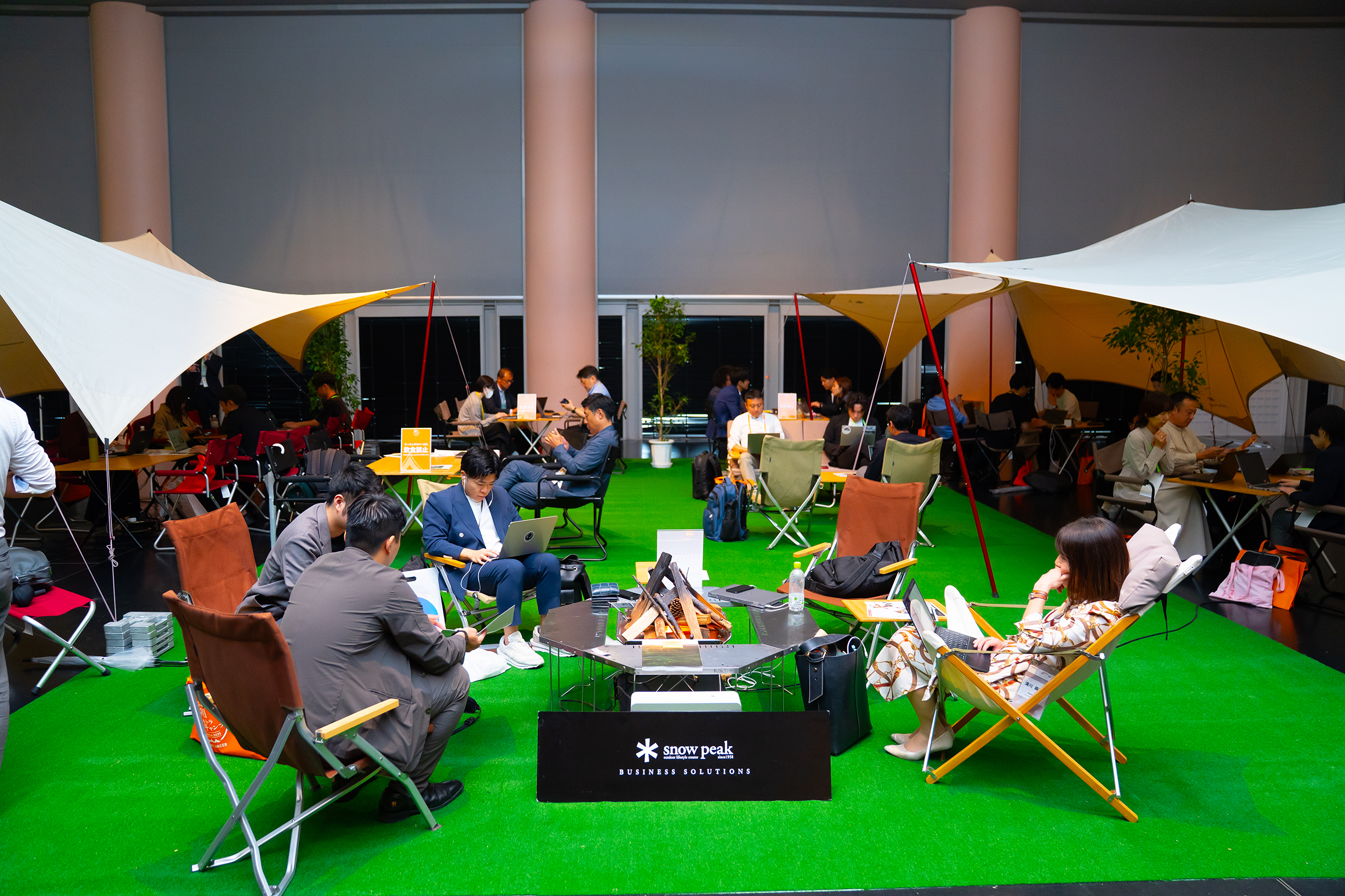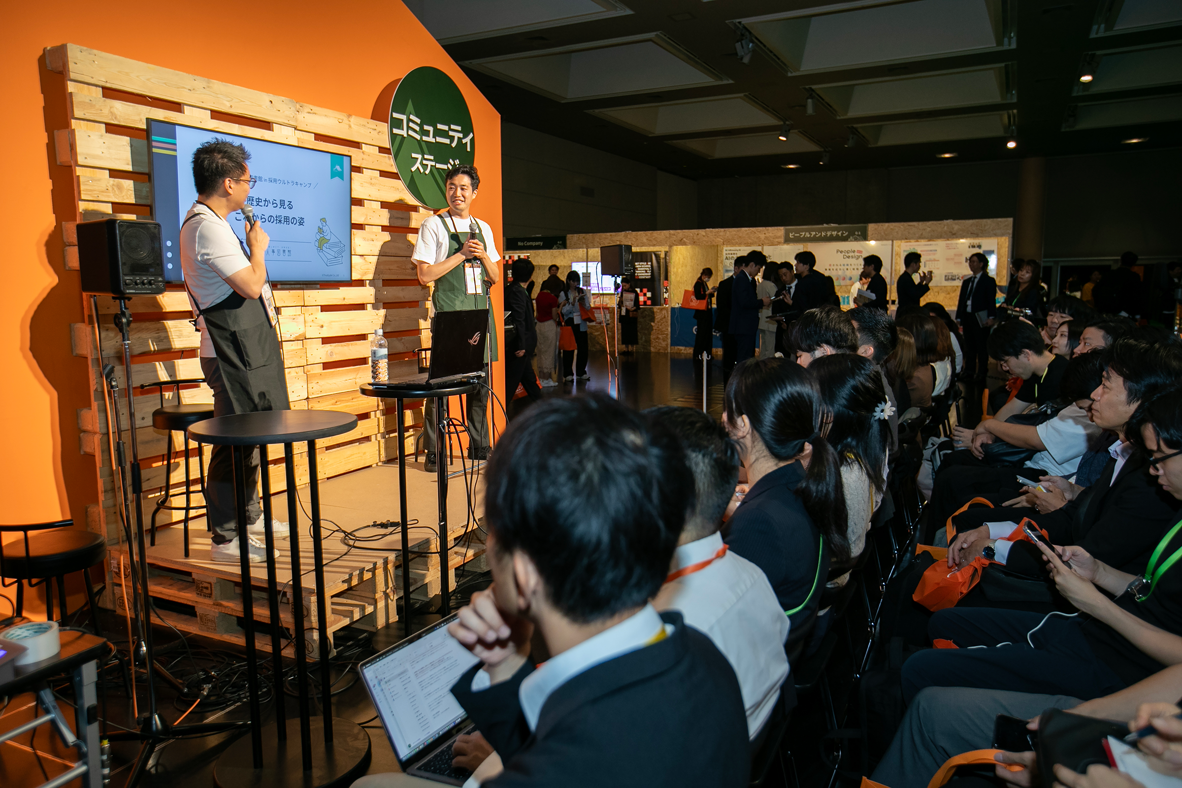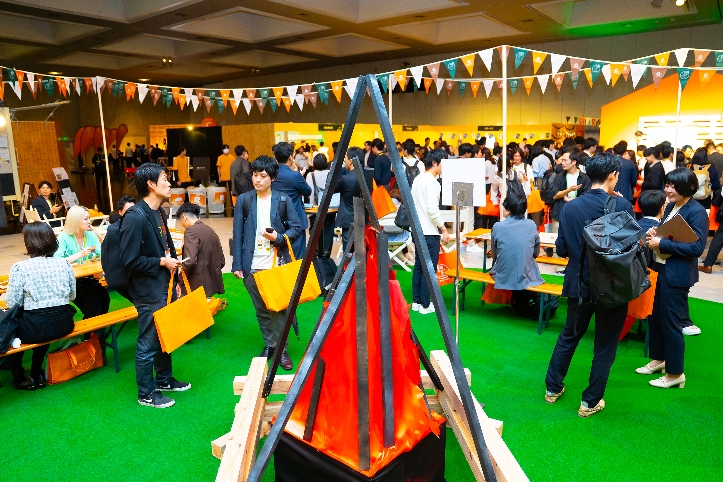 また、来場者同士のコミュニケーションの創出を目指して設けられたコミュニティスペースや、キャンプをモチーフにした会場内の各所では、初対面となる他業種の採用担当者同士が情報交換やセッションの学びを共有するなど、まさに本カンファレンスのコンセプトである“「採用」を開こう、そして超えよう。”を体現する光景が見られました。