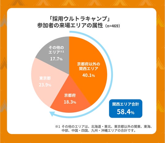 また、どのエリアから来場したかを尋ねると「関西エリア」が58.4%で最多(京都府以外の関西エリア〔40.1%〕と京都府内〔18.3%〕の合計)となり、続いて「東京」(23.9%)の順でした。「関西で採用に特化した大規模イベントがない中で、貴重な学びと交流の機会を作っていただいたことに深く感謝したい」というコメントも寄せられ、京都で開催する意義を感じる結果となっています。