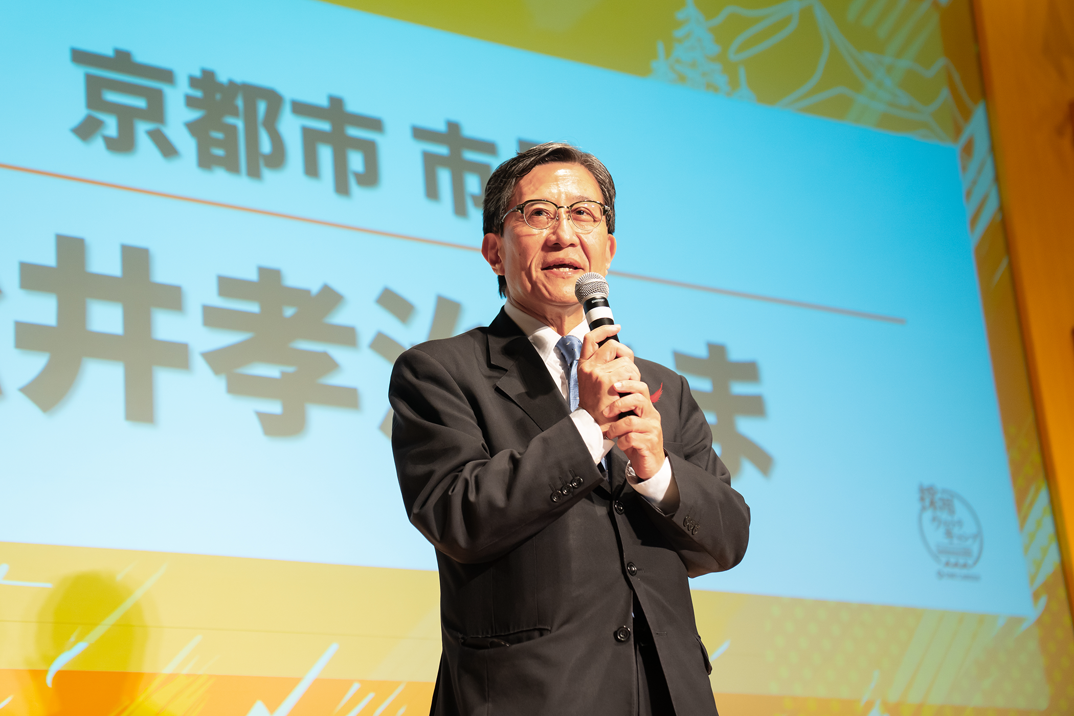 続いて、来賓として松井孝治京都市長が登壇。松井市長は、京都が15万人の学生を抱える日本有数の「学生の街」である一方、卒業後に京都府内に残る学生が約17~18%に過ぎないという地域が抱える課題を指摘。「多くの学生が京都の多様な人材や企業、社会課題に触れる機会が少ないまま、就職を機に京都から離れてしまう」という実情にも触れました。