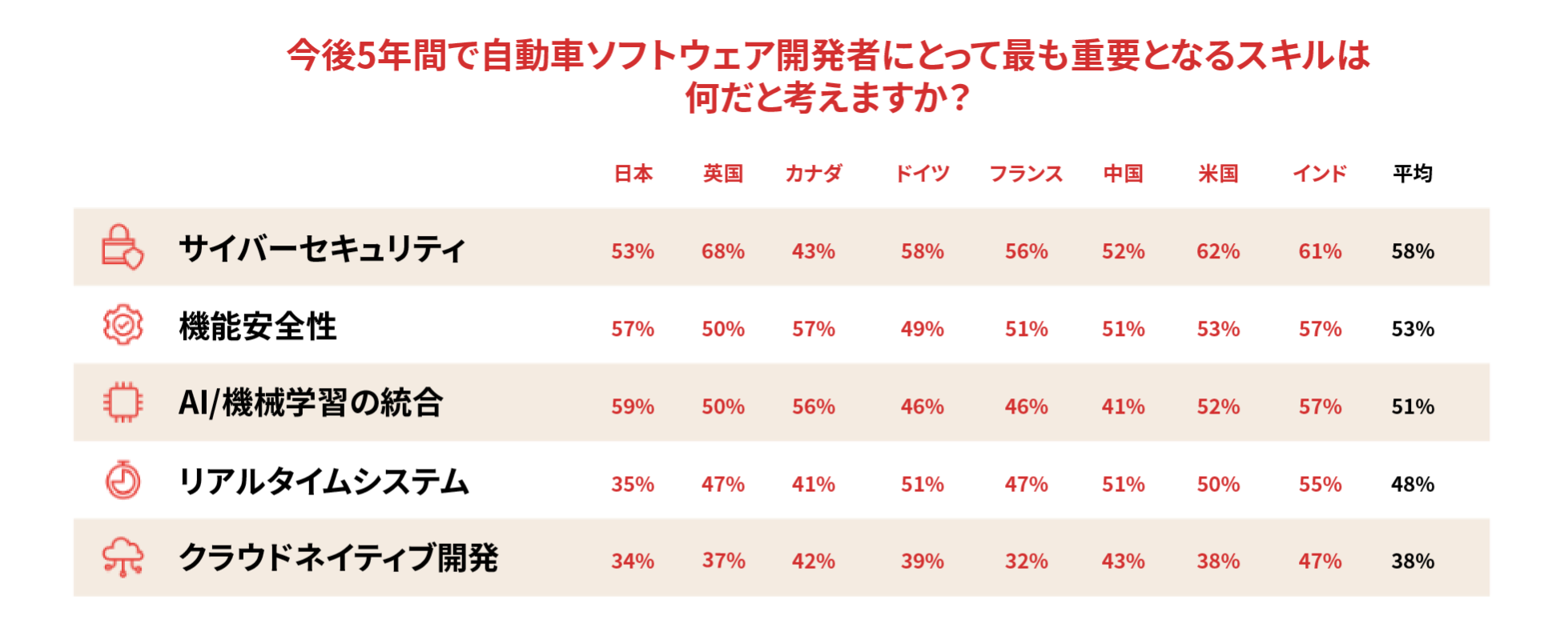 こうした中、最も困難と感じている規制の種類は、「サイバーセキュリティ」(49%)、「機能安全」(42%)、「AI/機械学習関連」(38%)で、いずれもグローバル平均を上回っています。これら3つの分野は、今後5年間で最も重要となるスキルとしても認識されており、「AI/機械学習の統合」(59%、グローバル平均51%)、「機能安全性」(57%、同53%)、「サイバーセキュリティ」(53%、同58%)との結果が示されました。特に「AI/機械学習関連」は規制分野における課題でも上位に位置付けられており、AIと機械学習は、日本のSDV開発環境において規制とスキルの両面で重視されていることがわかります。