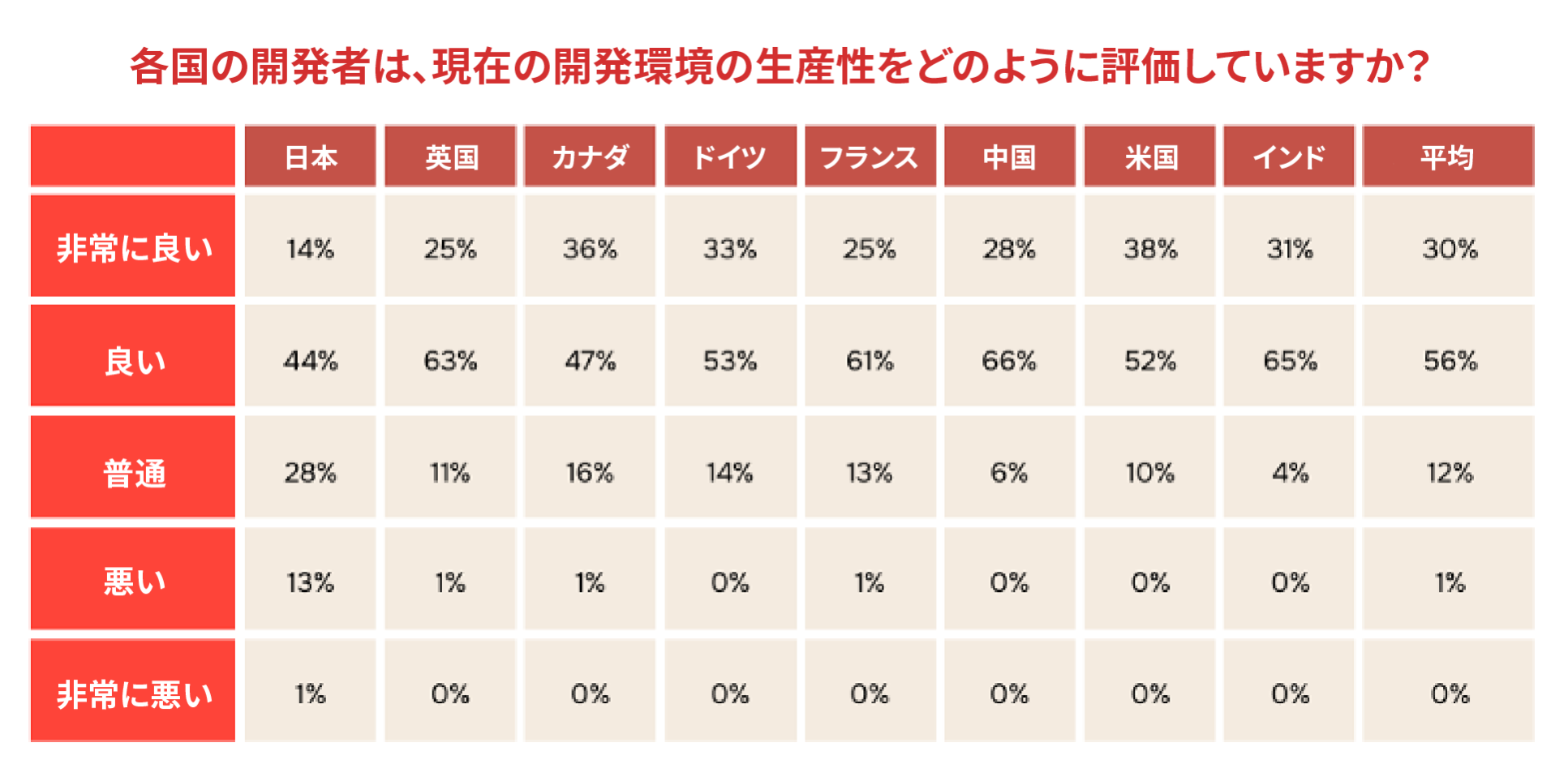 こうした課題意識は、開発環境の生産性に対する厳しい見方にも影響している可能性があります。現在の開発環境の生産性についての評価を問う質問に対し、日本の回答者が「非常に良い」と答えた割合は14%で、グローバル平均の30%を大きく下回りました。一方で「普通」(28%)、「悪い」(13%)、「非常に悪い」(1%)と答えた割合は、いずれも調査対象国のうち最も高い数字を示し、開発環境への評価がグローバルに比べて総じて低い傾向が浮かび上がりました。