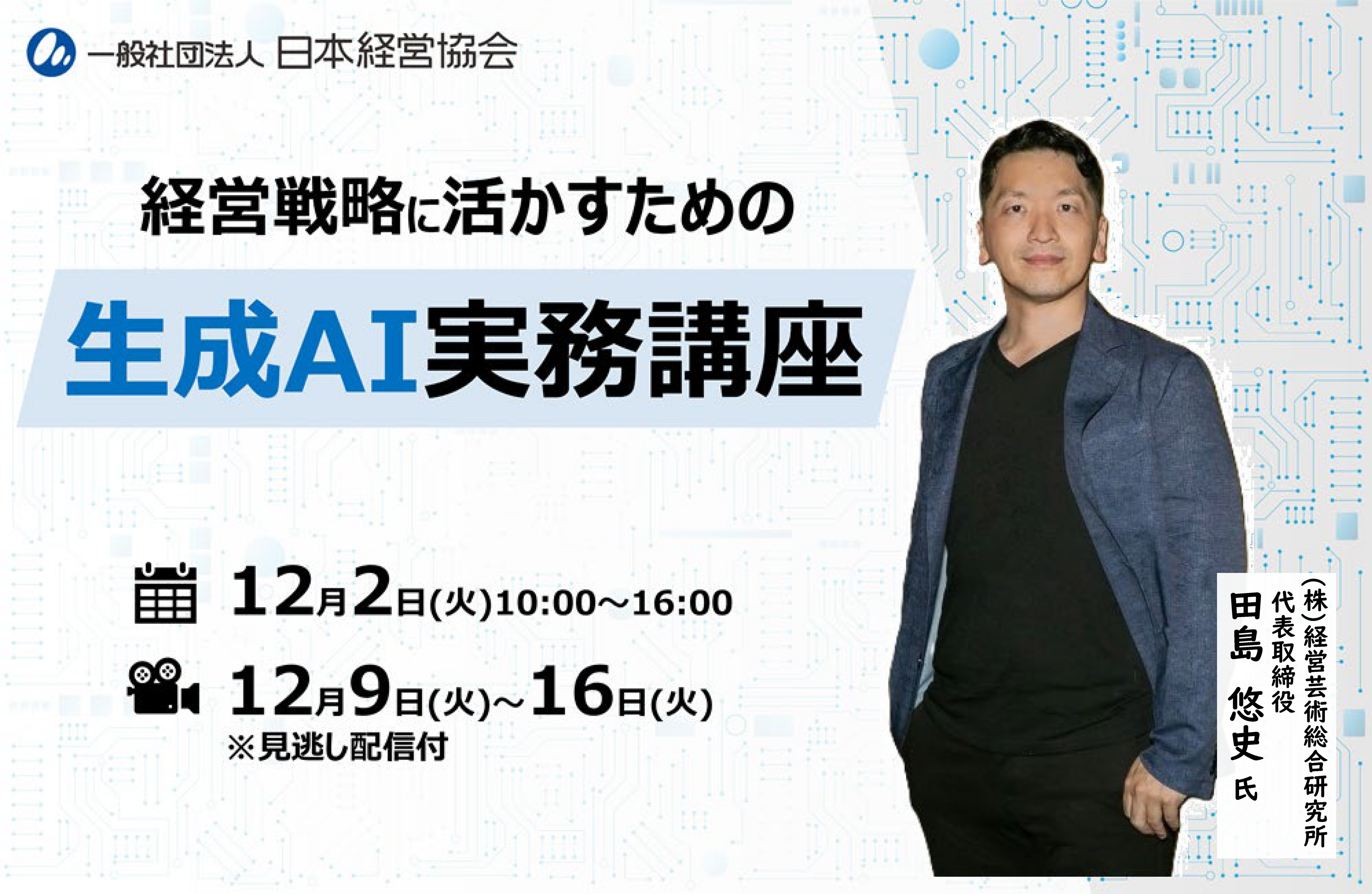 一般社団法人日本経営協会(本部事務局:東京都渋谷区、会長:高原 豪久)は、経営企画・事業企画・管理部門の実務担当者を対象に、生成AIを“経営の武器”として活用するための実践講座「経営戦略に活かすための生成AI活用実務講座」を2025年12月2日(火)にオンラインで開催いたします。