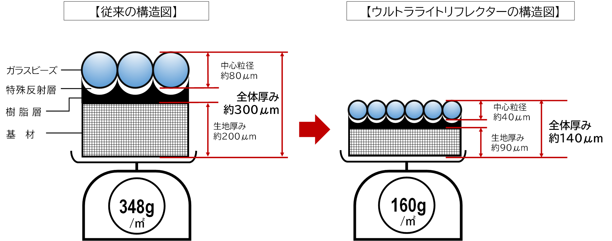 2022年9月に発売した「Ref Lite ウルトラライトリフレクター」は、半導体向けの精緻な製造技術を有する当社と、超軽量糸の製造技術を誇るカジレーネ株式会社(本社:石川県かほく市 代表取締役社長 梶 政隆)の技術を合わせて共同開発した、極薄軽量クロスです。従来のものと比較して体積比25%で製造が難しいとされていた40μmのガラスビースと、極細で超軽量糸を採用したことで、0.09mmの極薄かつ軽量のリフレクターが誕生しました。