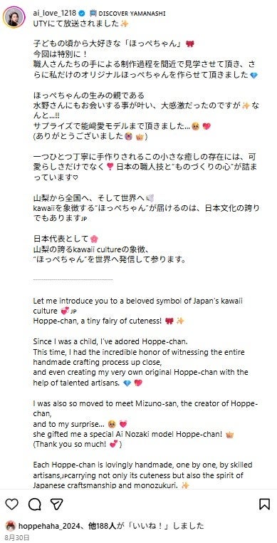 能崎さんは、山梨県大月市出身で、幼少期より「ほっぺちゃん」に親しんできたファンの一人。現在はモデル・司会者としても活躍する一方で、「やまなし大使」「おおつき大使」として地元の魅力を広く発信しています。この度の任命により、国際舞台で活躍する能崎さんと、今年で誕生15周年を迎える「ほっぺちゃん」が手を取り合い、“山梨発・世界行き”のグローバルプロジェクトがスタートします。