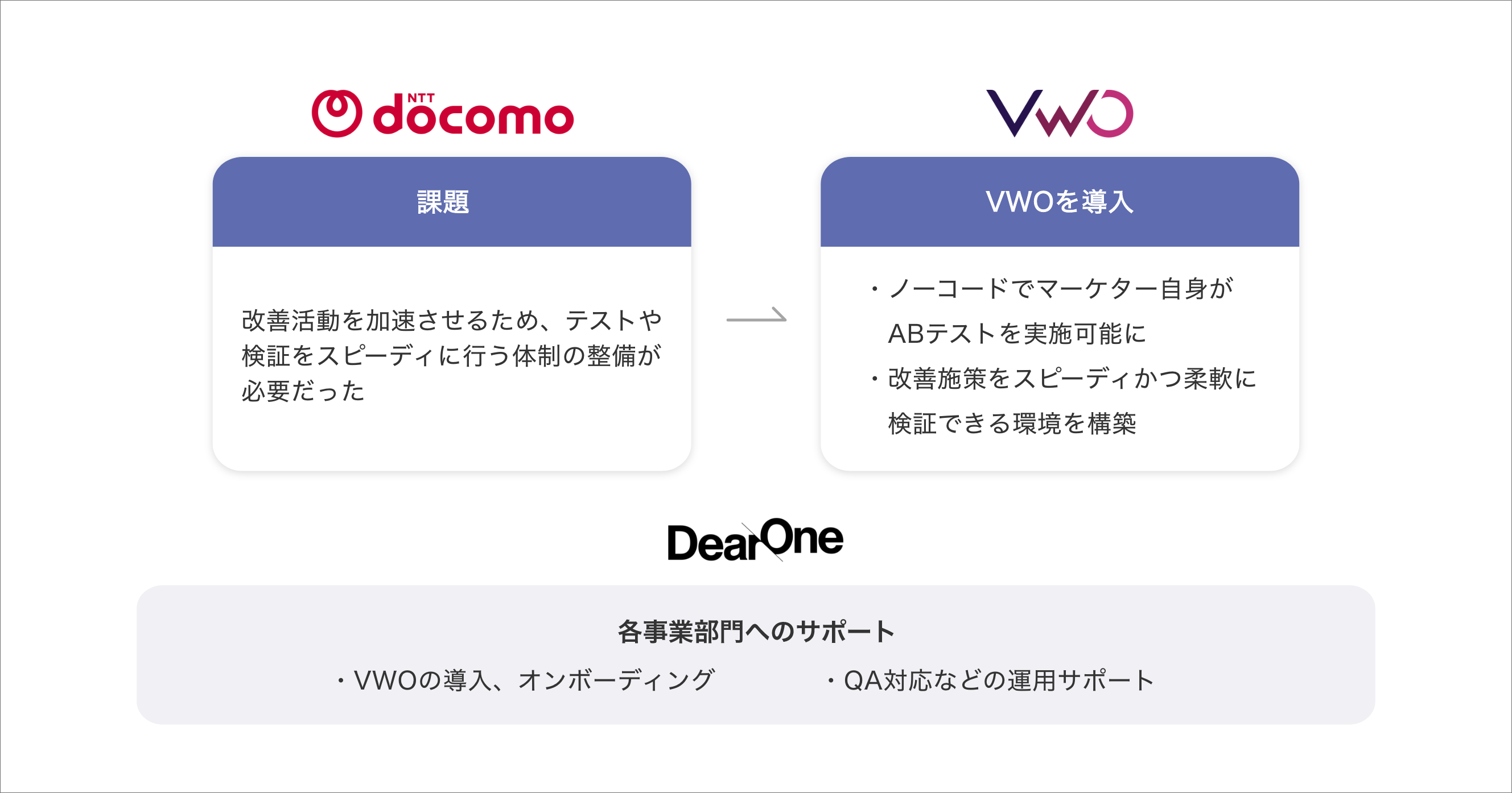 DearOneでは、導入後も、オンボーディングやQA対応などを通じて、ドコモ社内でVWOを円滑に活用できるよう継続的にサポートしてまいります。
