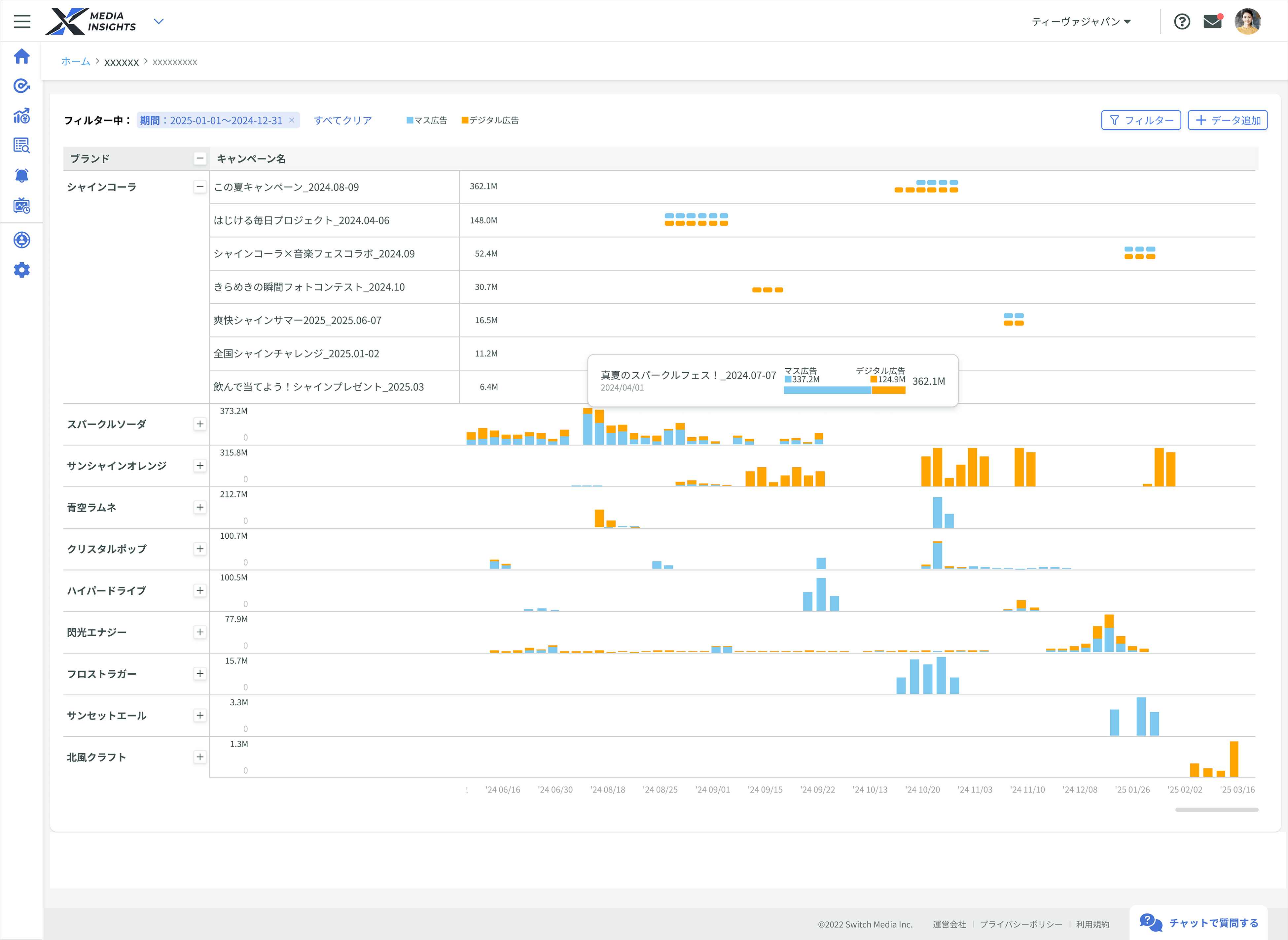 スイッチメディアについて株式会社スイッチメディアは、テレビCM+デジタル広告の出稿データを統一指標で一元管理し、過去比較やブランド横断分析を通じてメディア予算アロケーションを支援するSaaSプロダクト「クロスメディアインサイト」、また国内最大規模のテレビ視聴パネルから取得したテレビCM接触データとインテージ社の購買データ(SCI(R))をシングルソースで連携させ、テレビCMの売上効果の分析を実現するSaaSプロダクト「TVAL」の開発・運営を行っています。