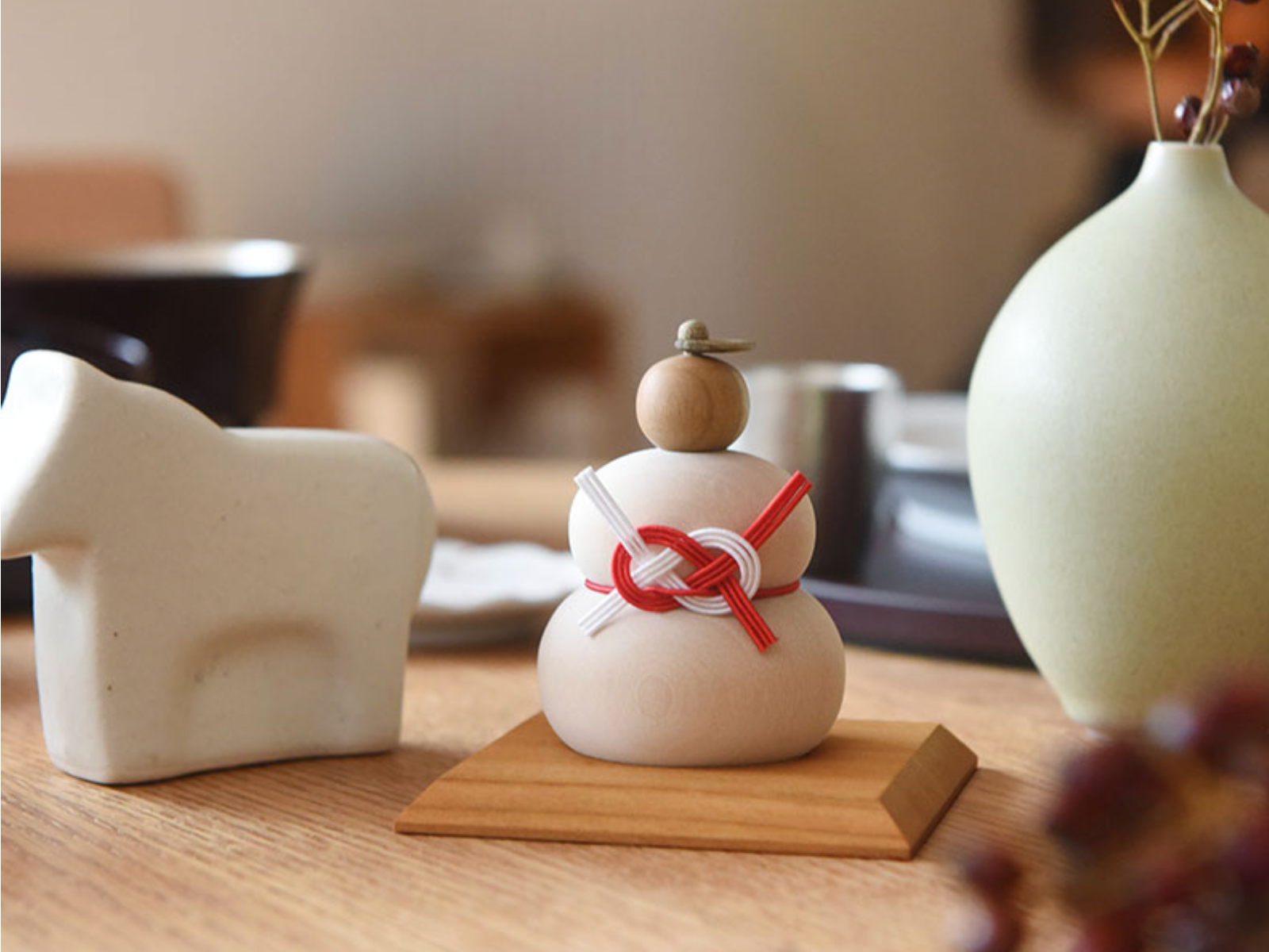 天然素材のあたたかみを楽しめる、木製の鏡餅。木工メーカー「ドリーミィパーソン」が手掛けた鏡餅に、「hare」のオリジナル水引が合わさった、アンジェ限定のコラボ作品です。
