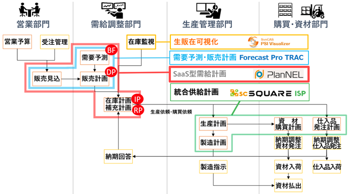このscSQUAREとPlanNELに搭載された5つの主要モジュールを組み合わせることで、需要予測から販売・在庫・供給計画に至るまで、SCMプロセス全体の業務を柔軟かつ網羅的に支援可能です。