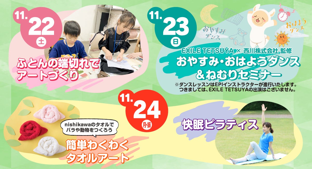 神奈川県立 花と緑のふれあいセンター『花菜ガーデン』では、2025年11月22日(土)~24日(月・振)に〈nishikawaコラボFes.〉を開催します。自然環境と睡眠は私たちにとって大切なもの。1566年の創業以来、快適な眠りを追求し続けるnishikawaは、トップアスリート愛用の[エアー]をはじめ、まくらや布団など様々な寝具で人々の快適な眠りをサポートしています。花と緑がいっぱいの『花菜ガーデン』で、“ちょっと寝“を体験したり、楽しみながら睡眠の大切さを学びましょう!