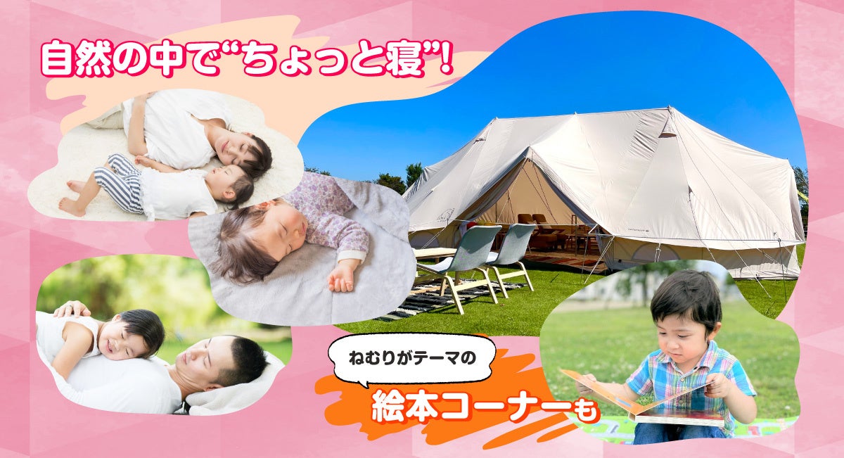 広々とした芝生エリアに設営されたテントの中でnishikawaのマットレスやまくらなどを体験しながら“ちょっと寝”が楽しめます!
