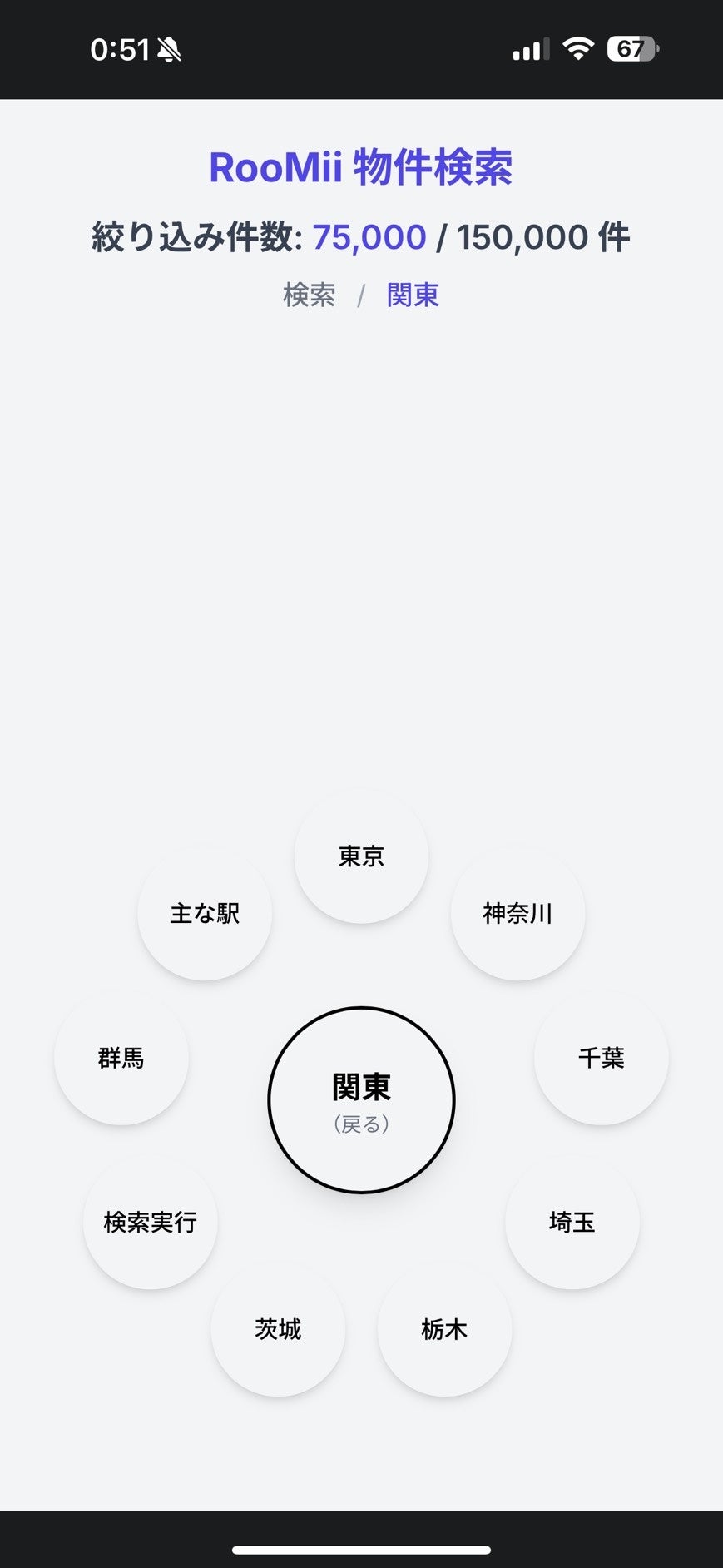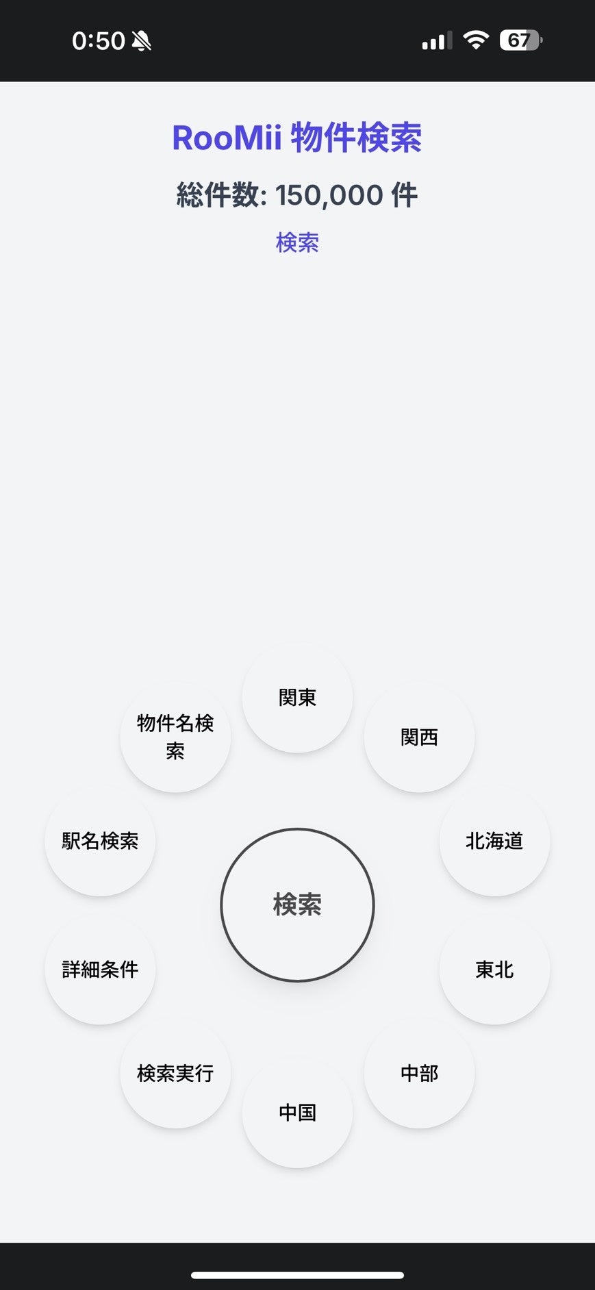 「サークルUI」の初期画面(不動産検索デモ)。「関東」などのエリアや、「物件名検索」「詳細条件」といった検索方法が画面中央から円形に配置される。総件数(150,000件)もヘッダーに表示。