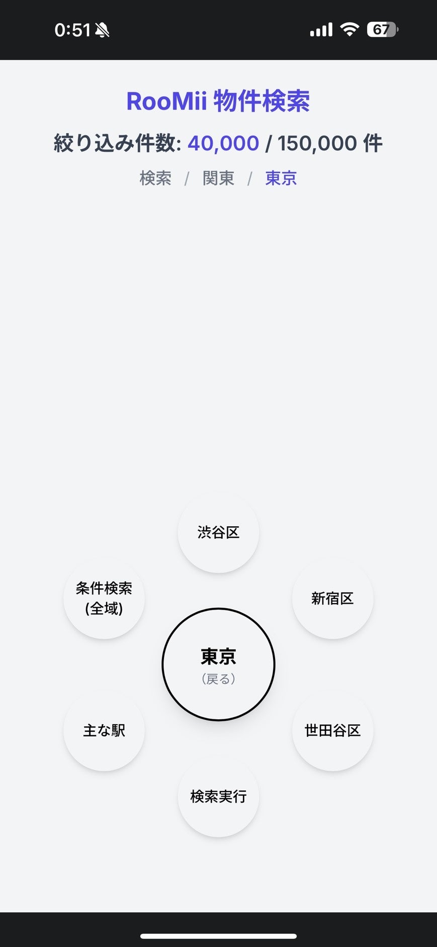 従来の不動産検索アプリでは、「エリア選択」→「路線・駅選択」→「価格帯」→「間取り」→「こだわり条件」と、縦長の画面を何度もスクロールしながら、多数のチェックボックスを一つ一つタップして選択する必要があります。 特にスマートフォンでは、画面の小ささも相まって操作が煩雑で非効率的でした。
